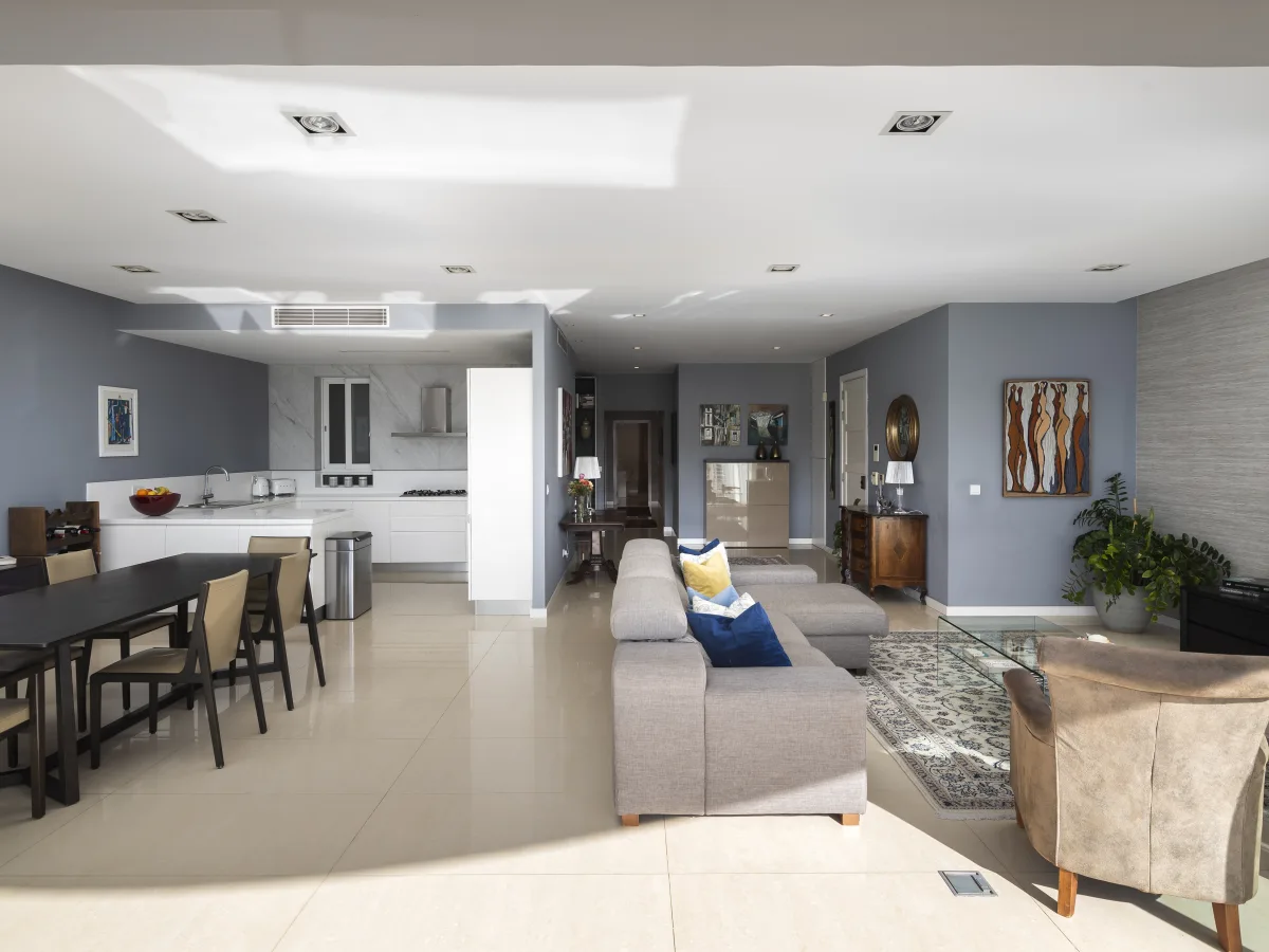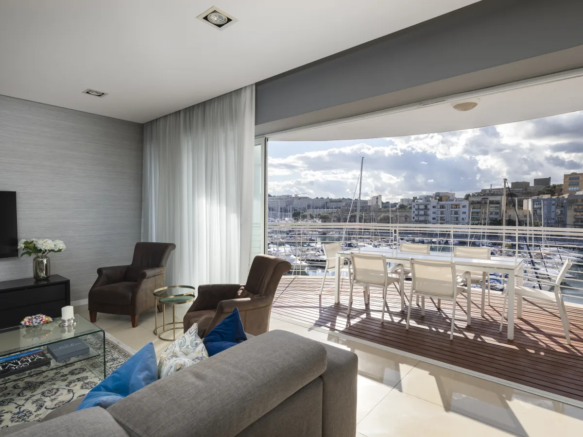 The residence features a spacious open plan living and dining area, seamlessly connected to a modern kitchen, perfect for both entertaining and everyday living. The living space extends onto a generously sized, beautifully furnished terrace, where you can enjoy stunning views of the marina.