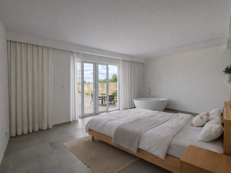 To the right of the entrance hall, one finds two bedrooms, including a master suite complete with en-suite facilities and a large walk-in wardrobe, enjoying direct access to the pool deck and gardens.