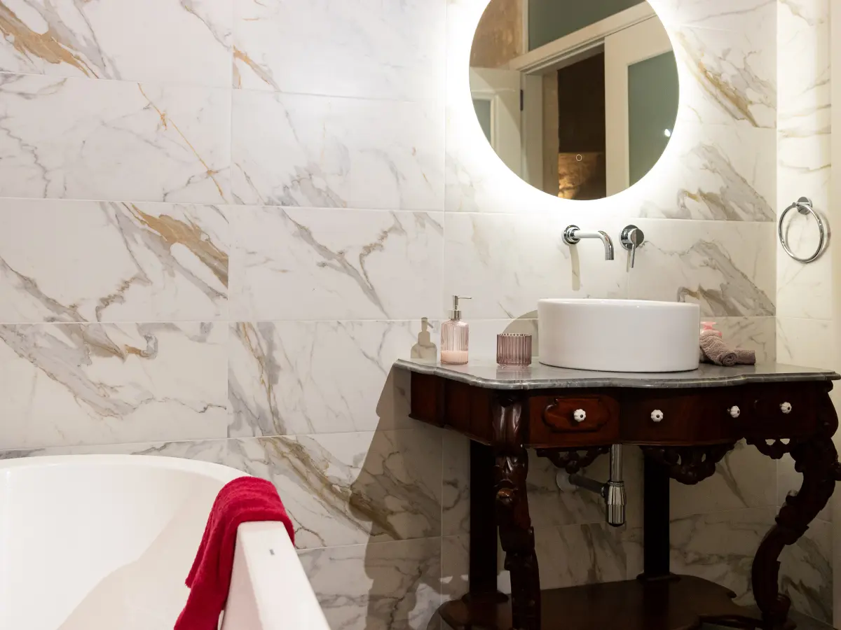 Upon entering, you are greeted by a seamless flow of traditional features, where exposed limestone walls and original arches meet soaring ceilings. The heart of the home is designed for both intimate family life and grand-scale entertaining, featuring a bespoke kitchen and dining area that transitions naturally into the living quarters. The marriage of traditional stone slabs and premium modern finishes creates an atmosphere that is both grounded and sophisticated.