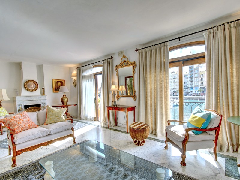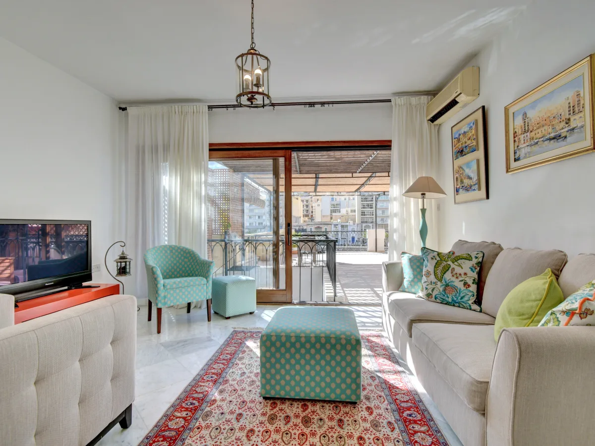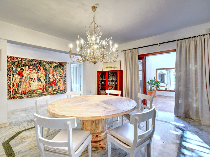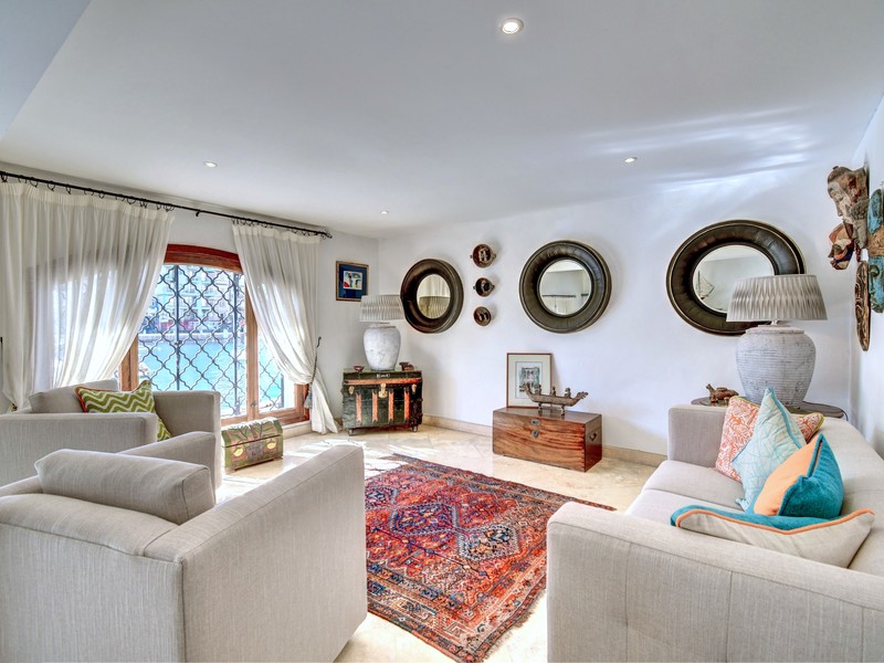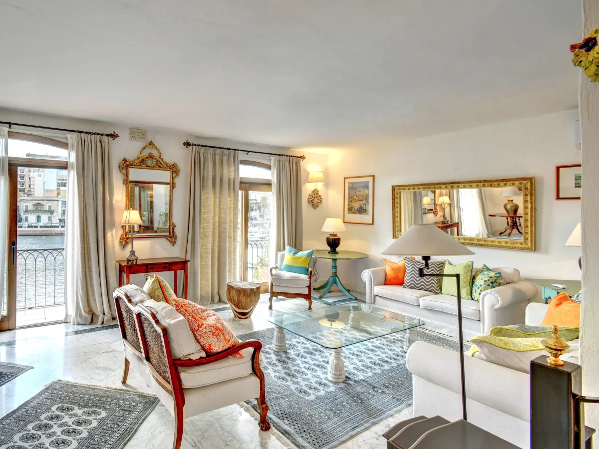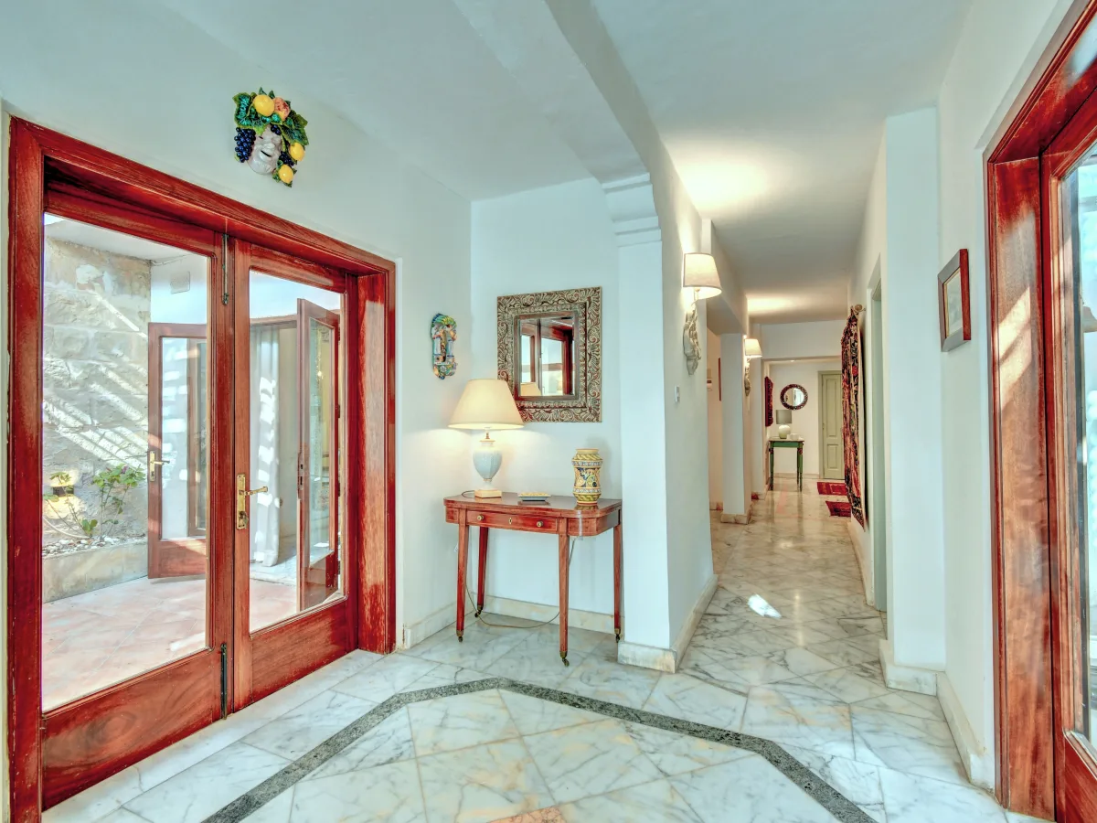 The upper floor features a welcoming entrance hall, a spacious living room that opens onto an expansive terrace with stunning views, three double bedrooms, each with en-suite facilities, as well as a kitchenette and laundry room. The middle floor offers a separate kitchen with a pantry, a grand dining room, a formal living room with a fireplace, and a sunlit seafront balcony. This level also includes two courtyards, one with a fountain and the other with a breakfast area and a spiral staircase leading up to the main terrace. The ground floor boasts a split-level sitting room with direct access to the bay.