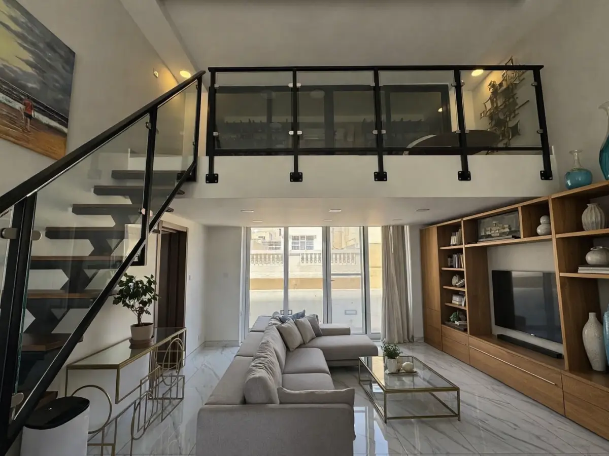 Upon entering the upper level, one is welcomed by an impressive double-height ceiling, creating a bright and spacious atmosphere. This level features an intermediate floor with a library or study area, overlooking an open-plan sitting, dining, and kitchen area. The living space leads onto a large sun terrace, ideal for entertaining, complemented by a guest WC and a back balcony.