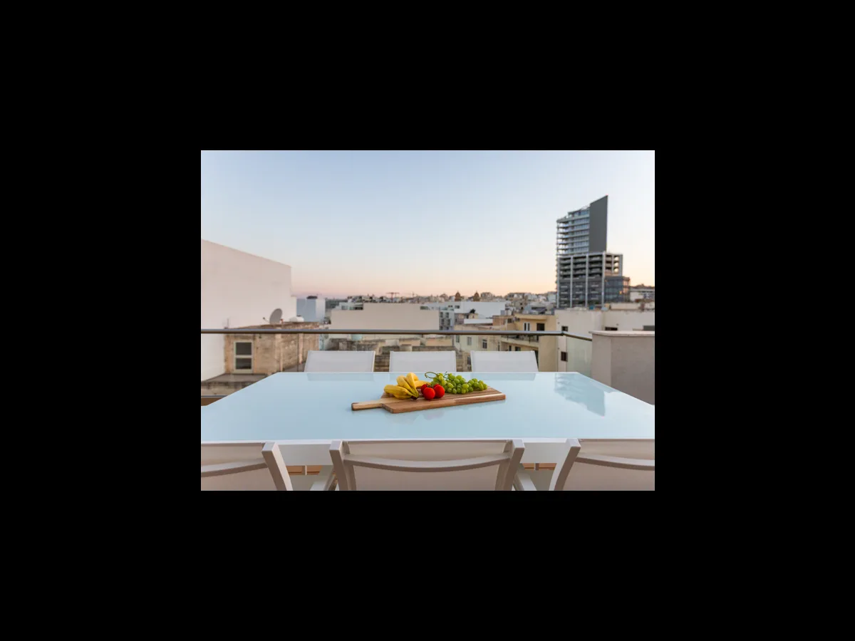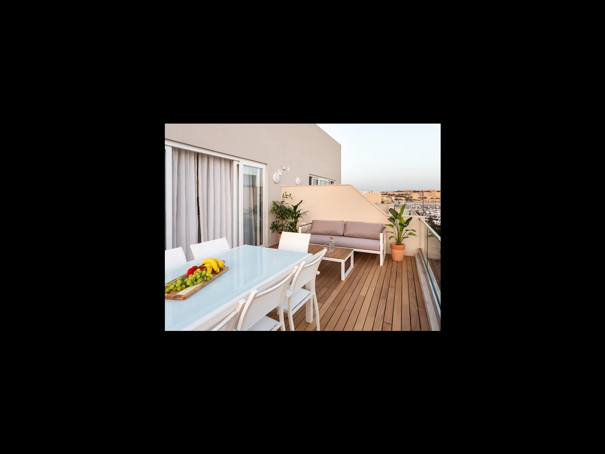 The property has been tastefully furnished and meticulously finished, enjoying a spacious layout and an abundance of natural light throughout. It features a welcoming entrance hall that leads into an open plan kitchen, living, and dining area, opening onto a sizeable front terrace, perfect for al fresco dining, sun lounging, and entertaining. The terrace is equipped with a BBQ and offers side views of a yacht marina and the Valletta skyline.