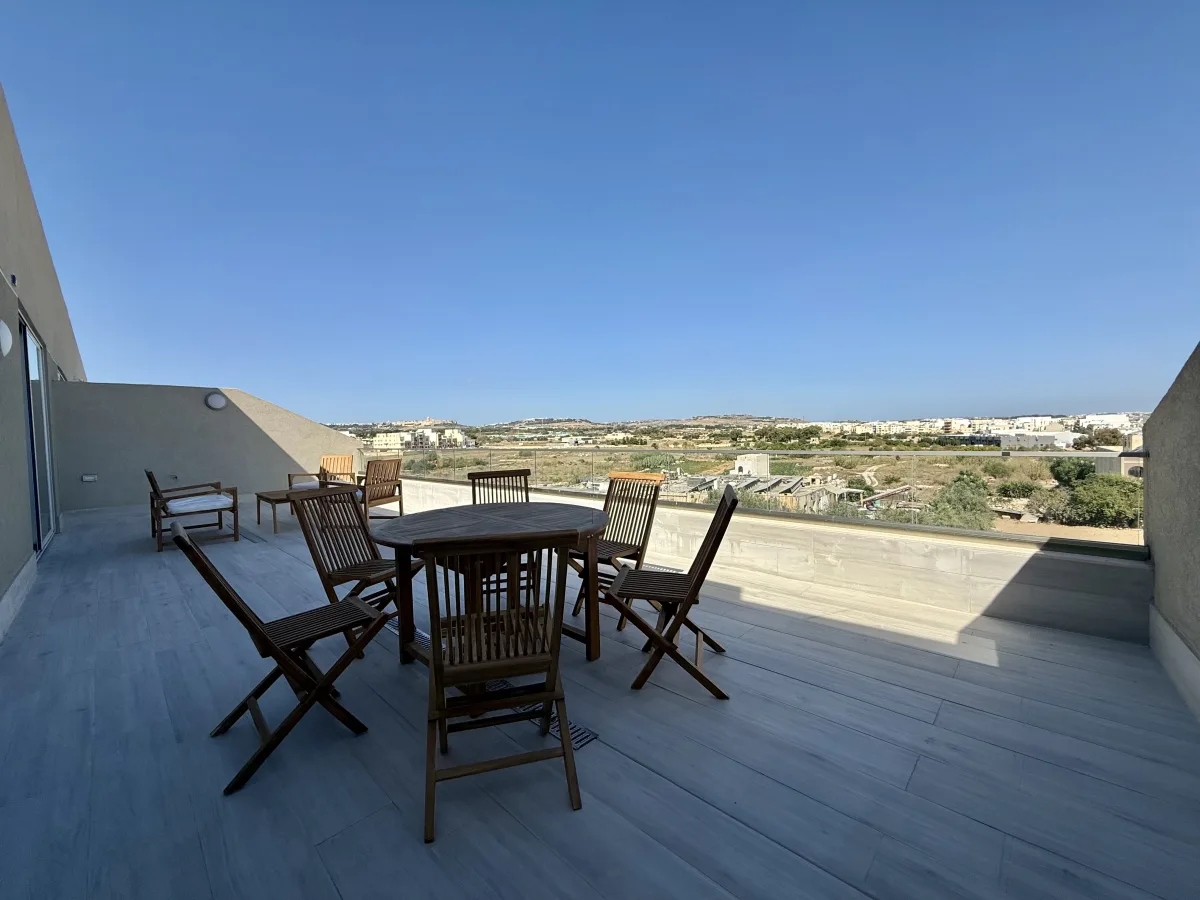 The heart of the home features a bright and airy open plan kitchen, living, and dining area that seamlessly flows onto a generously sized front terrace. This outdoor space is ideal for sun lounging, al fresco dining, and entertaining, all while overlooking a tranquil green area that adds to the property's sense of serenity and openness.