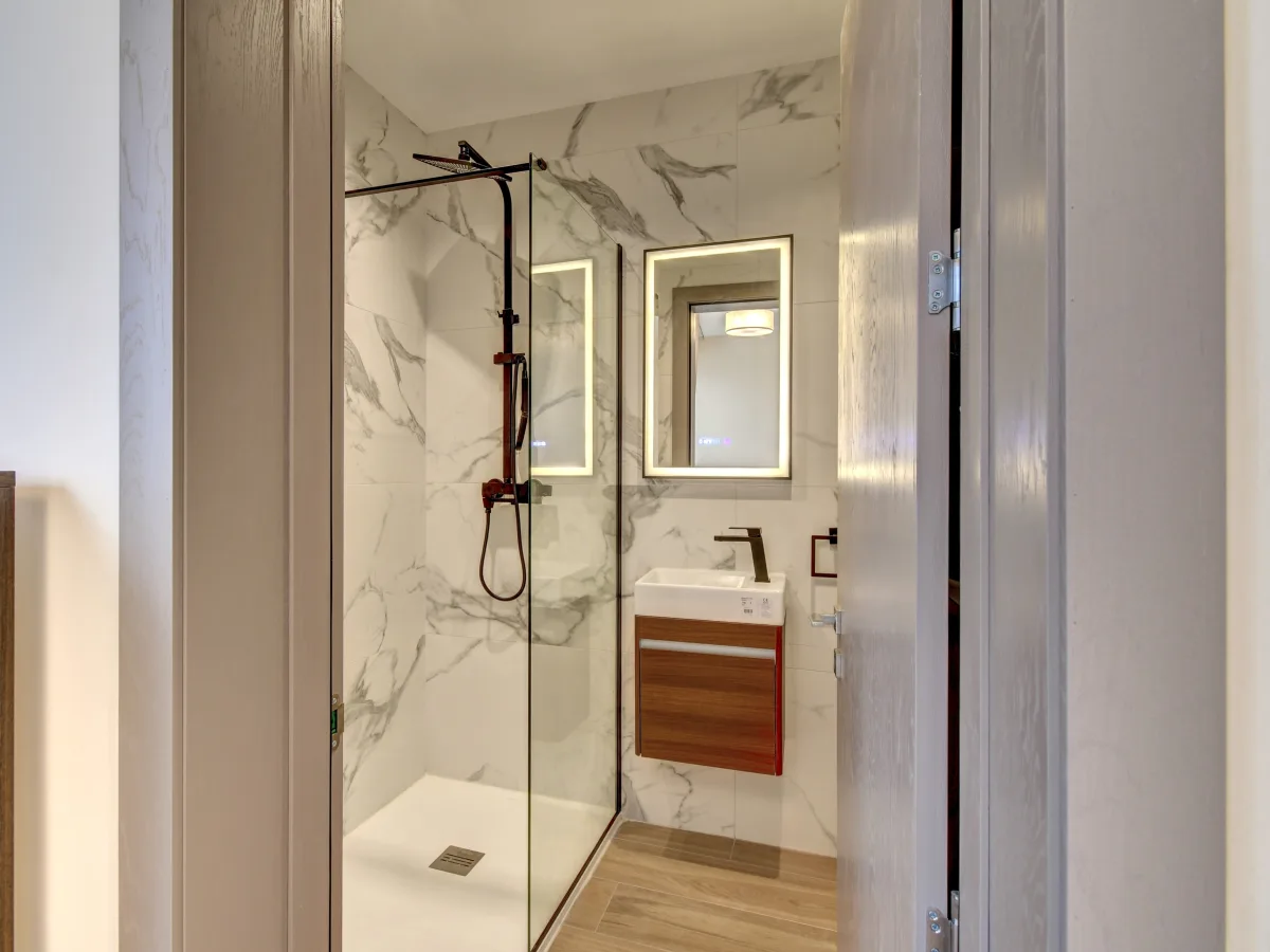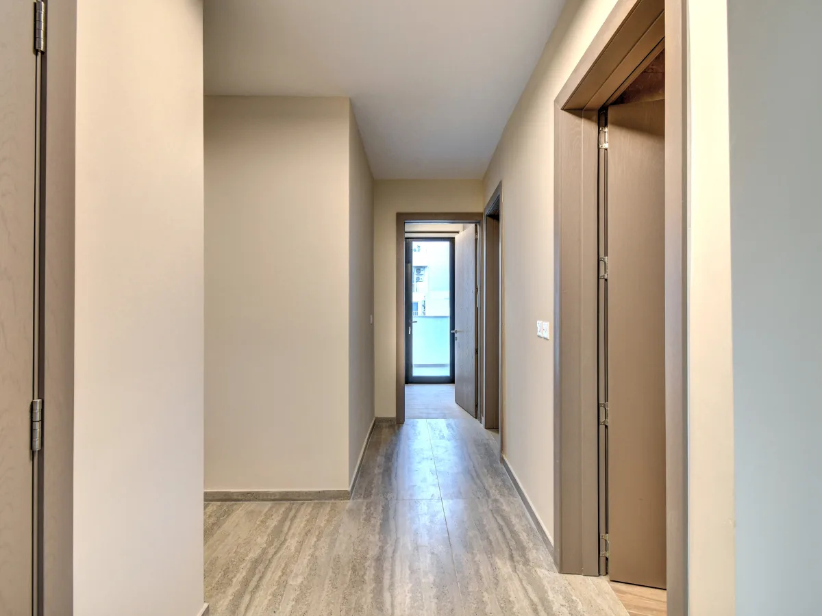 The apartment features three double bedrooms, each with its own en-suite facilities, guests bathroom and a rear balcony with partial sea views. Fully equipped and airconditioned, the property is also serviced by a lift for added convenience.
