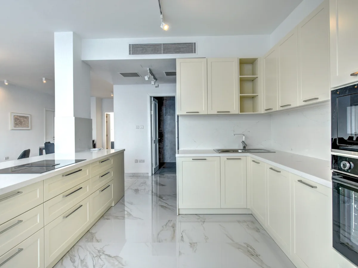 The penthouse features three spacious bedrooms and four modern bathrooms, designed for ultimate comfort. The fully equipped kitchen includes high-end appliances, complemented by a wine cooler for the discerning resident. Combining contemporary style, unmatched outdoor spaces, and a prime seafront location, this property offers an exceptional lifestyle in one of Malta’s most sought-after areas.