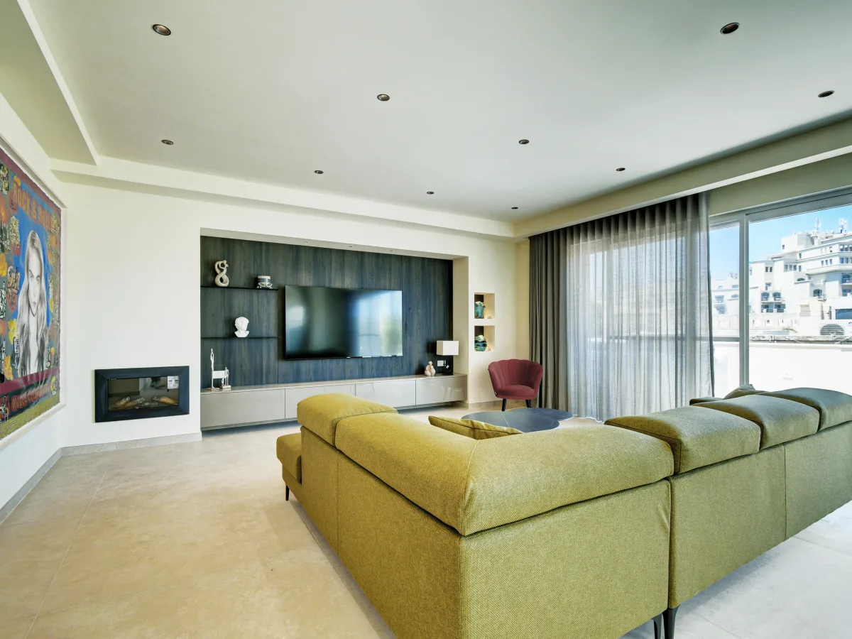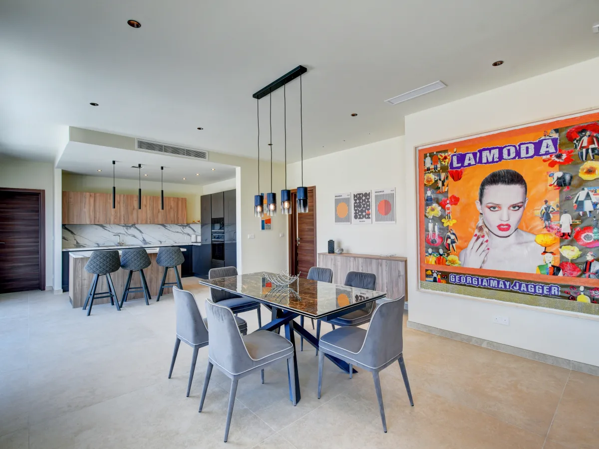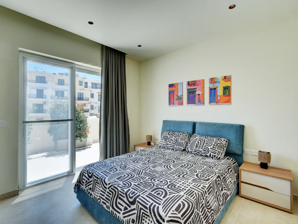 The standout feature is its expansive terrace, boasting breathtaking sea views over Balluta Bay, perfect for entertaining or unwinding in the sun. The bright, open plan layout includes a modern kitchen, dining, and living area that opens onto a front balcony, flooding the space with natural light. Boasting two double bedrooms, one with en-suite, and a third single bedroom ideal for guests or use as a home office.