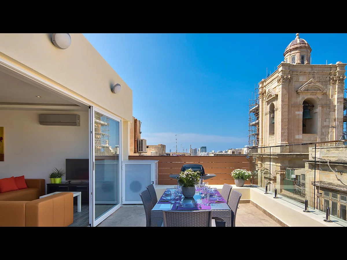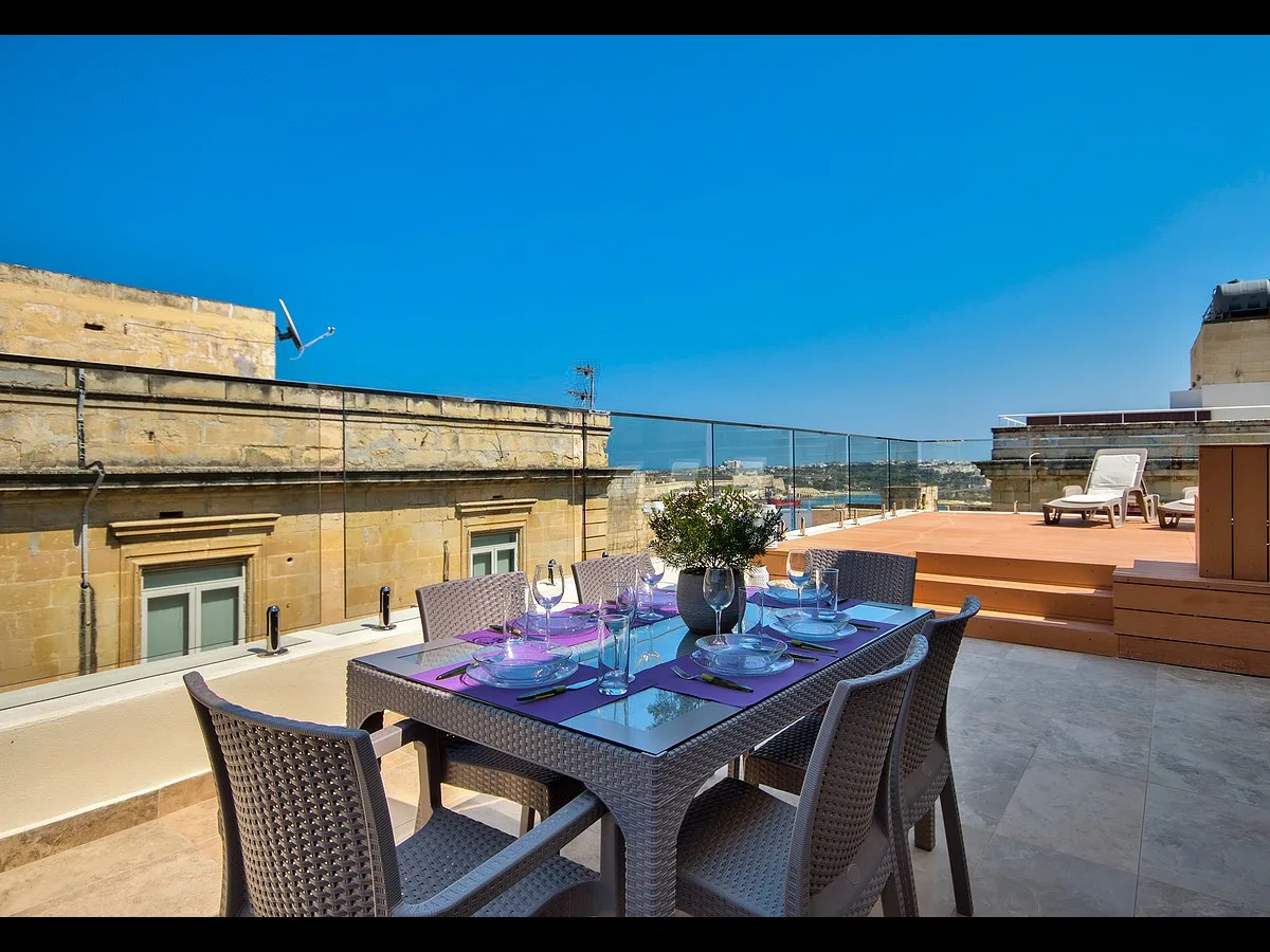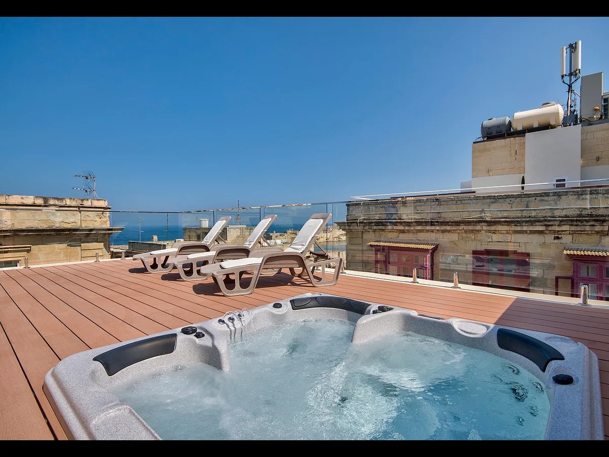 The topmost floor is engulfed by light and is out-shined by the impressive terrace overlooking Malta's Grand Harbour. The open plan kitchen, living and dining area is characterized by sleek modern furniture, including pops of colour to contrast with the contemporary neutral walls. The stylish kitchen is fully equipped, perfect for creating mouth-watering home cooked meals. The living area is defined by two plush 3 seater sofas, which frame the led TV. Another family bathroom is located just off of this area, equipped with a shower – ideal for a post hot tub wash. The terrace is the main focus of this floor, flooding the whole area with natural light. On the terrace one may find outdoor dining facilities, perfect for group meals al fresco. The hot tub gives the penthouse that additional lush feel, beckoning anyone with a promise of utmost relaxation. The sun loungers are ideal for catching up on some rays, perfect for our sweltering Maltese summers. The view from the terrace is truly breathtaking, the Grand Harbour shines in all its splendor beneath you, reminding you why the name 'Grand' befits it perfectly.
