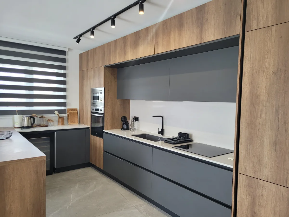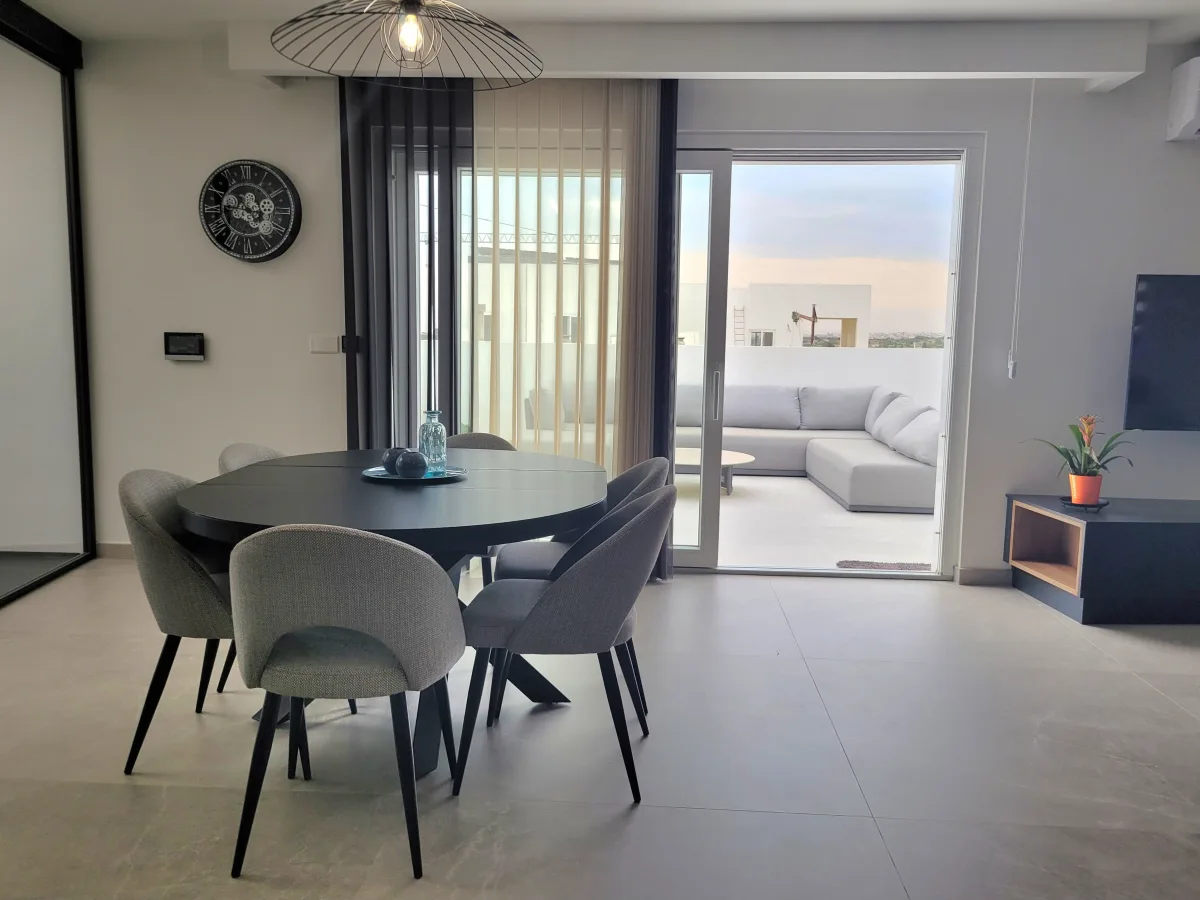 Upon entering, you will be welcomed by an arched hall adorned with a luxurious marble floor. The mezzanine floor features an open-concept lounge/study area furnished with a comfortable sofa, creating a cozy space to relax and unwind. The second floor is dedicated to the sleeping quarters, featuring three bedrooms. The main bedroom boasts an ensuite bathroom and a spacious walk-in wardrobe, and the other two bedrooms are sharing the main bathroom. The top floor is a true gem, offering a bright and airy living area that seamlessly integrates with a modern kitchen with pantry and an elegant dining space. Large windows flood the space with natural light, creating a warm and inviting atmosphere. The area opens up to a spacious terrace with a delightful swimming pool, offering a perfect spot for outdoor relaxation and entertainment. This home has been tastefully furnished, ensuring a warm and inviting ambiance, making it an ideal setting for a wonderful family living experience. Every detail has been carefully considered to ensure both comfort and aesthetics.
