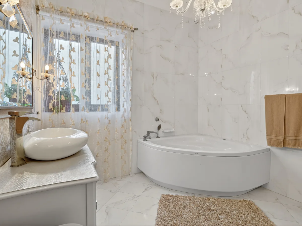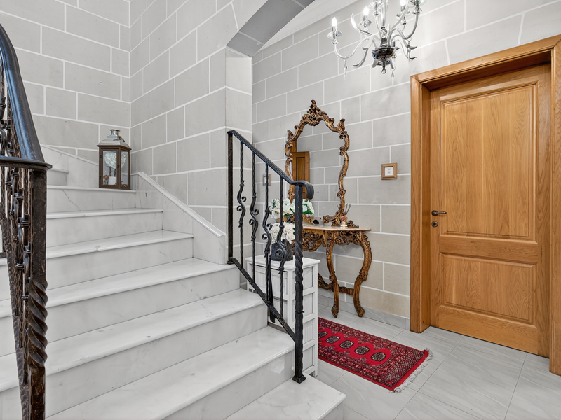 A marble staircase leads to the upper floor, comprising three large double bedrooms, a family bathroom, an en-suite shower, two balconies, and a large back terrace. The roof level includes a washroom and a roof terrace.