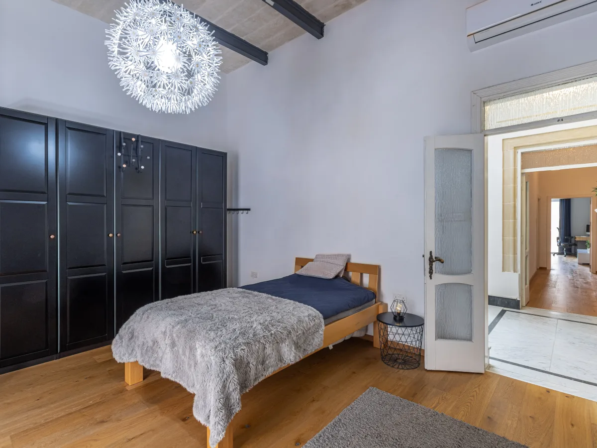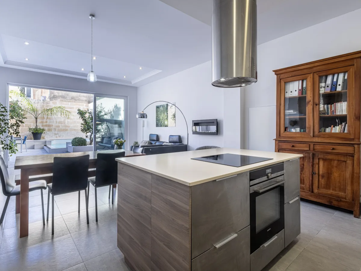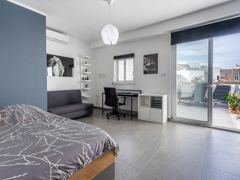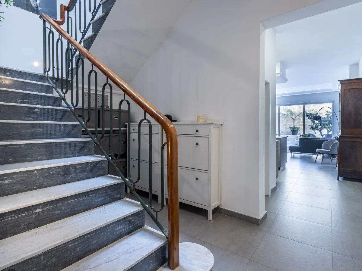 A sleek marble staircase leads to the first floor, where a spacious double bedroom opens onto a traditional Maltese balcony, while the main bathroom offers relaxation with its bathtub and towel warmer. A practical laundry room adds convenience, and the master bedroom becomes your personal sanctuary, complete with a walk in wardrobe, a luxurious en-suite, and a balcony overlooking the peaceful pool area.