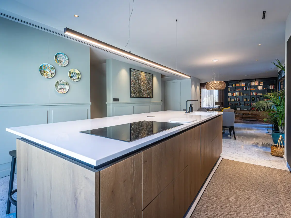 The home is set on an elevated ground floor, where one is welcomed into a beautifully designed open-plan living, dining, and kitchen area, thoughtfully crafted for both everyday living and sophisticated entertaining. The interiors are adorned with exquisite marble flooring in the main living spaces, seamlessly complemented by warm parquet finishes in the bedrooms, creating a perfect balance of refinement and comfort.