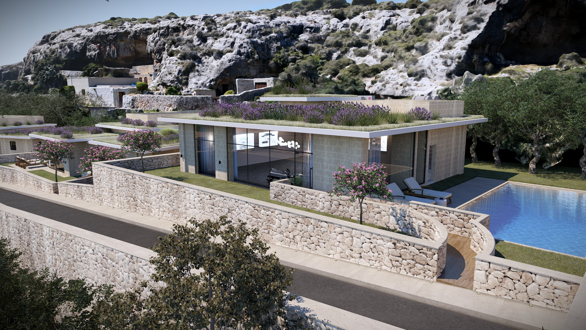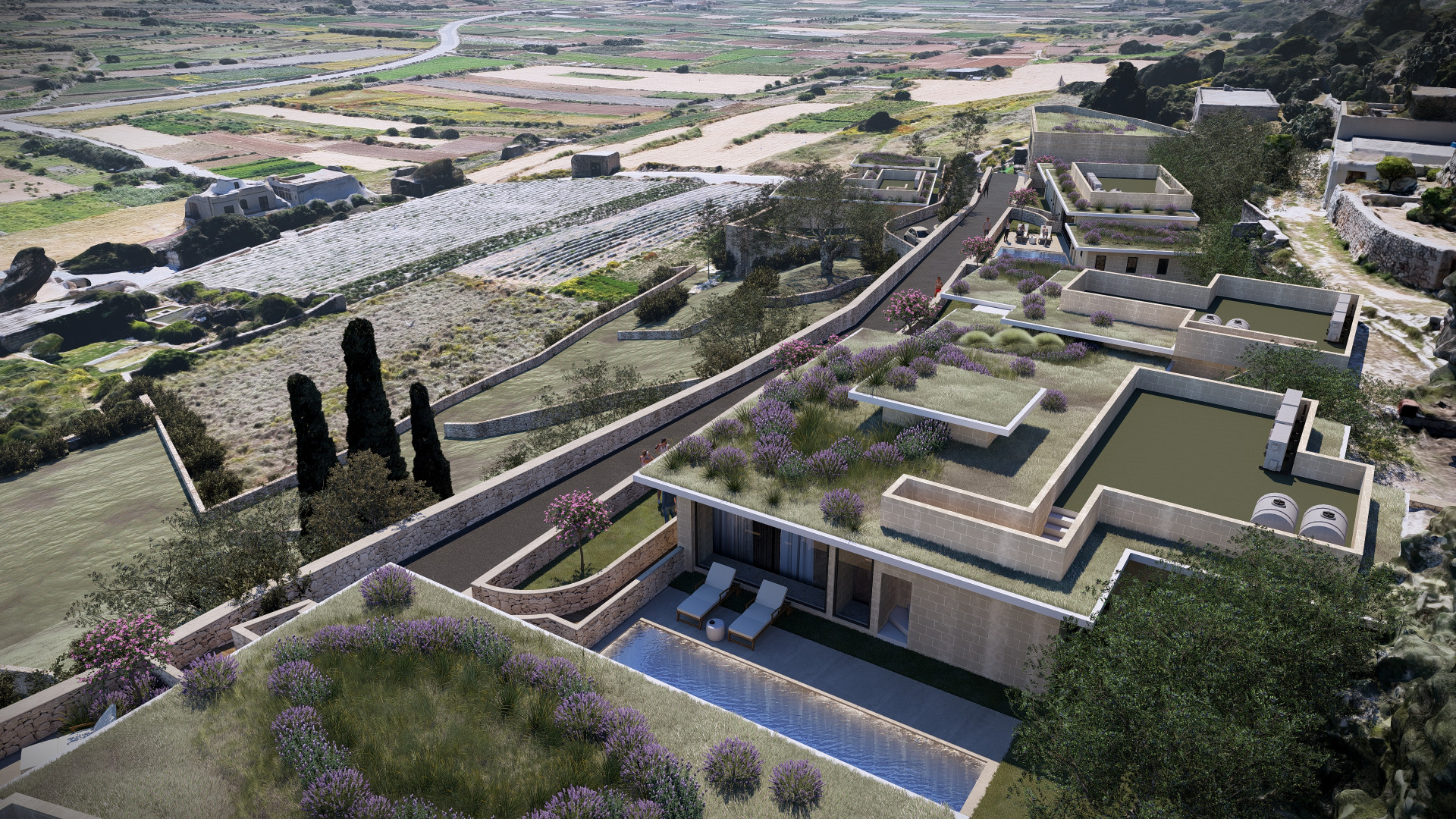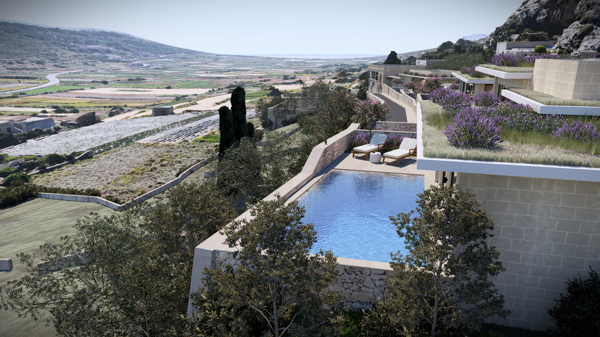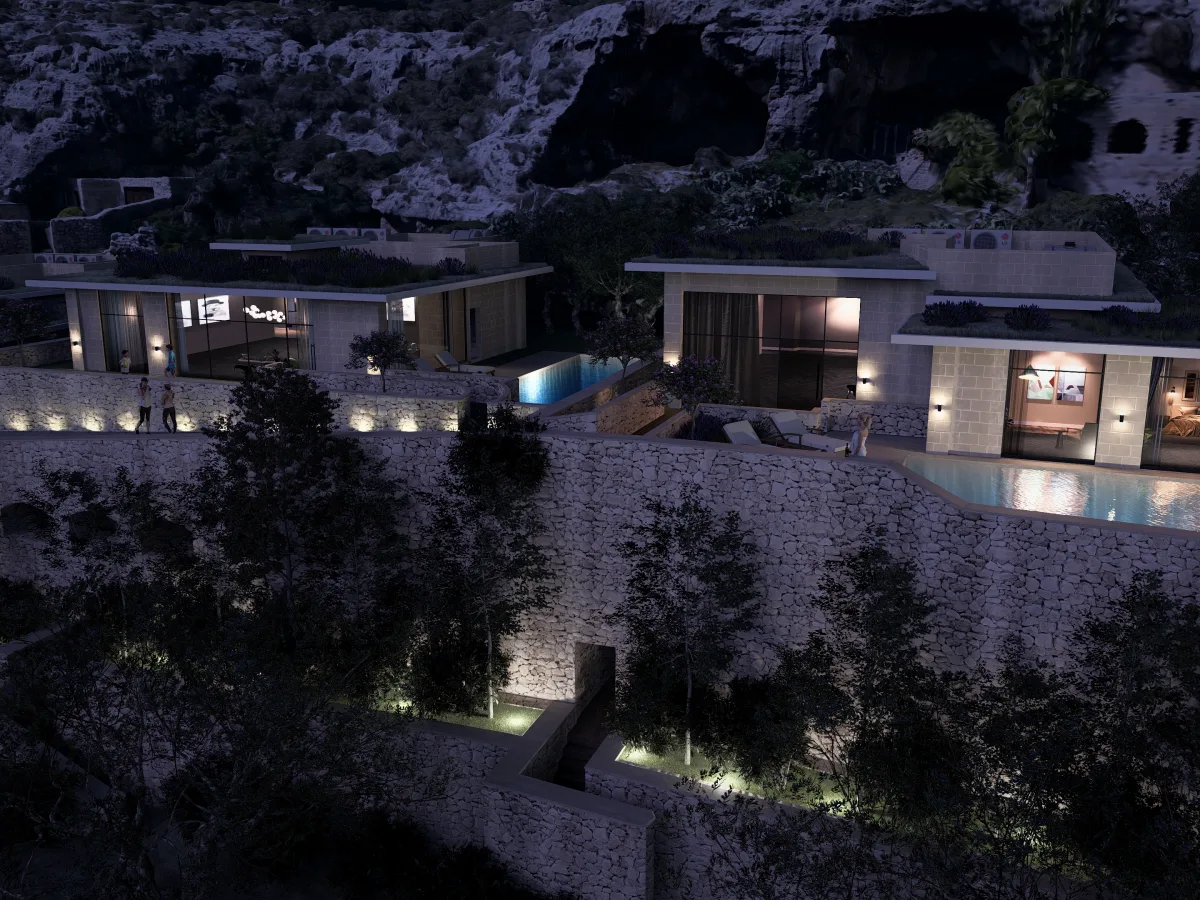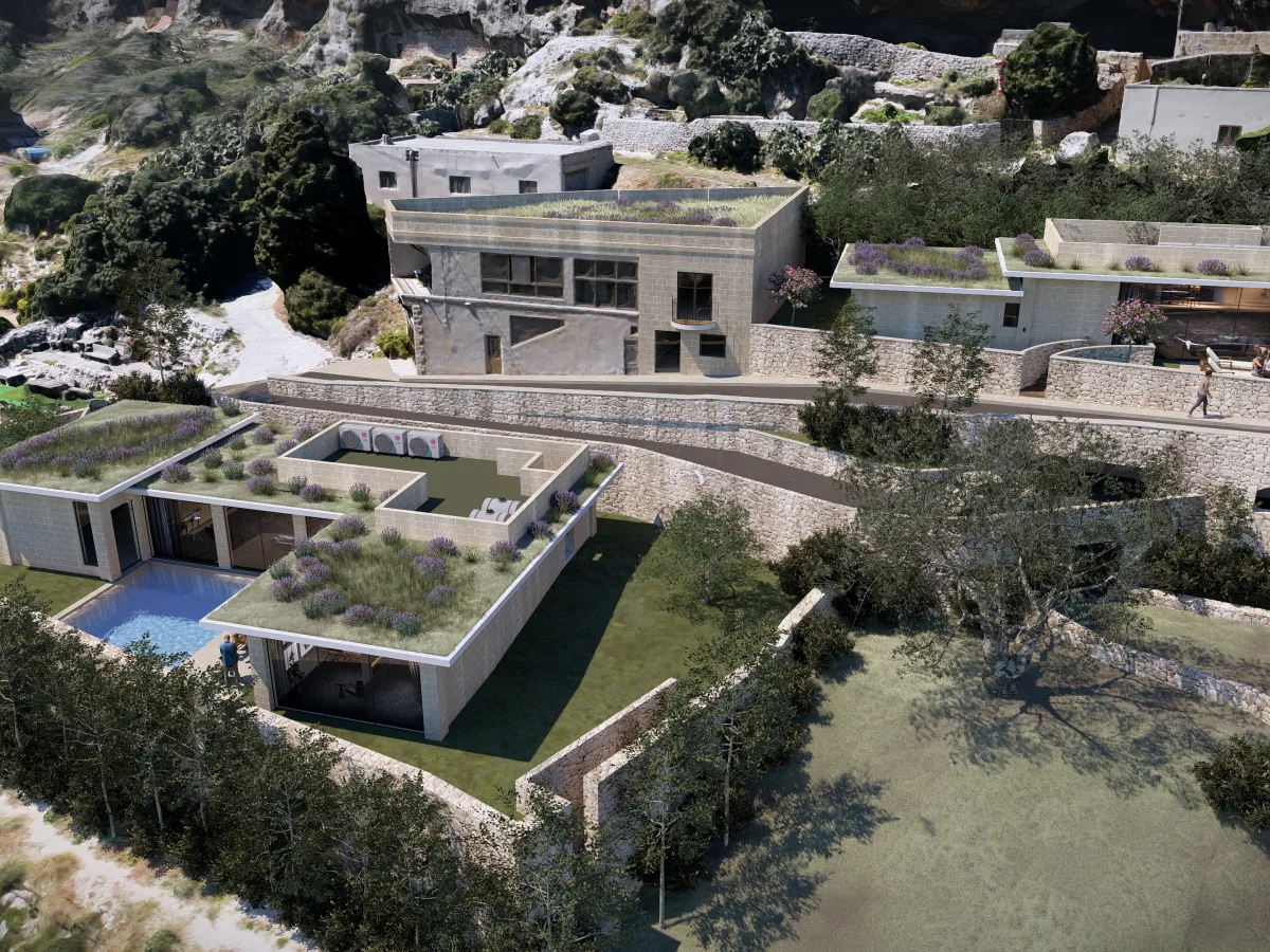 The basement level has been thoughtfully designed with a drive through, two car garage, a convenient WC and ample space for all the services together On the lower level, an agricultural store leads out onto an amazing lower 1120sqm garden which will be home to Olive trees, Aleppo pine trees, Judas and Cypress trees, Prickly Pears and shrubs.
