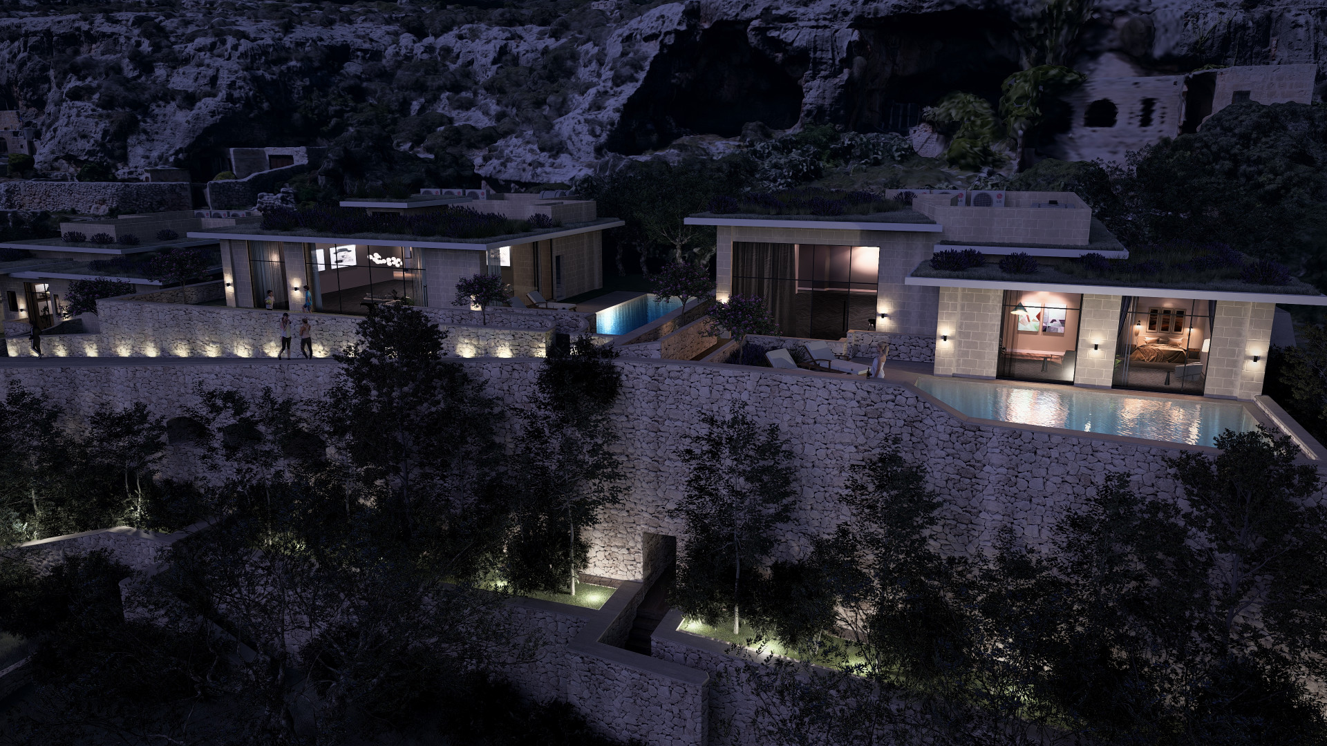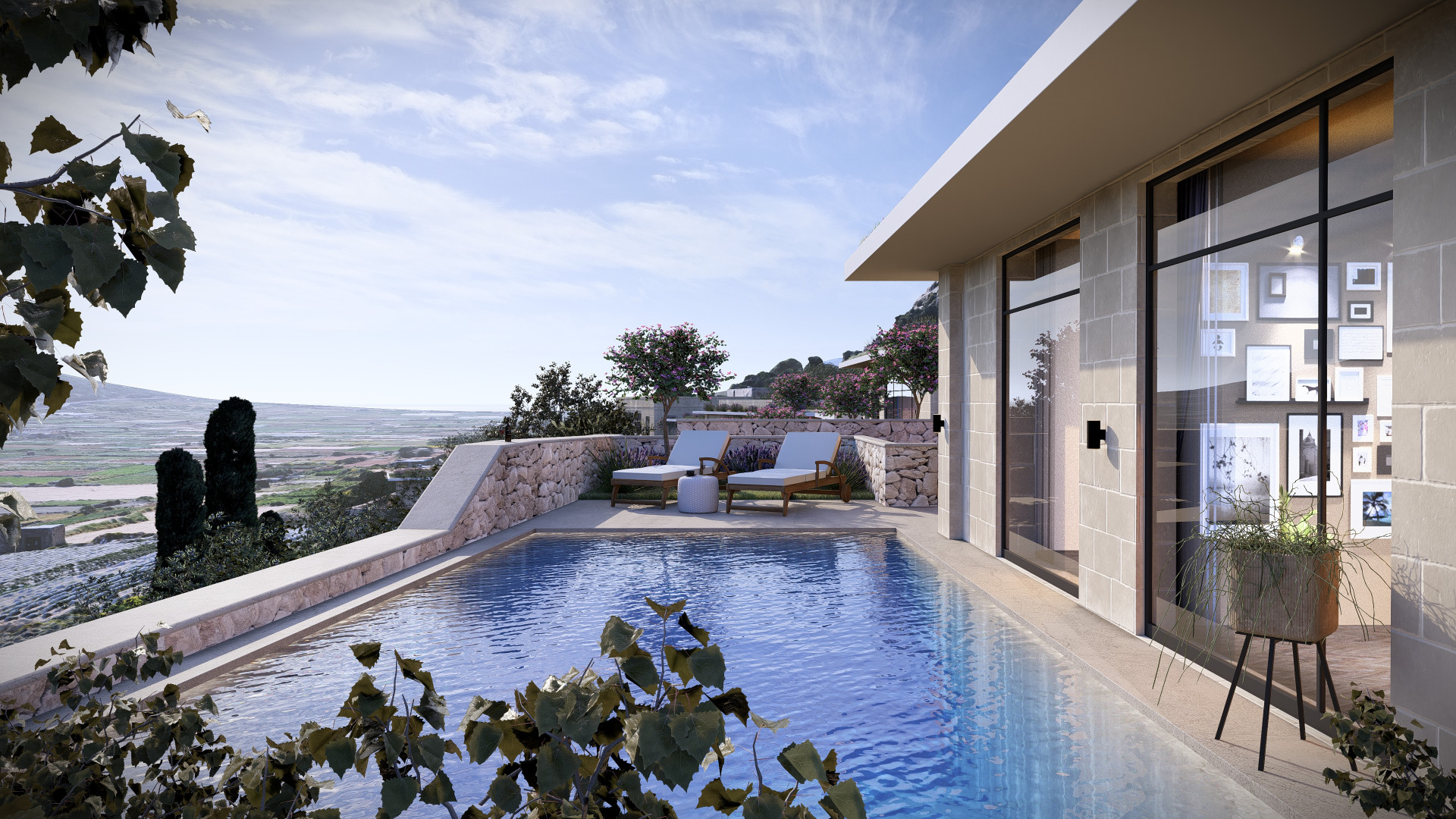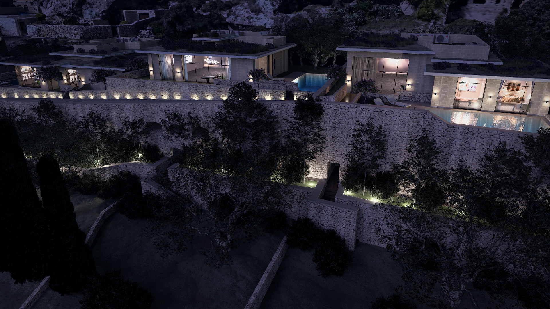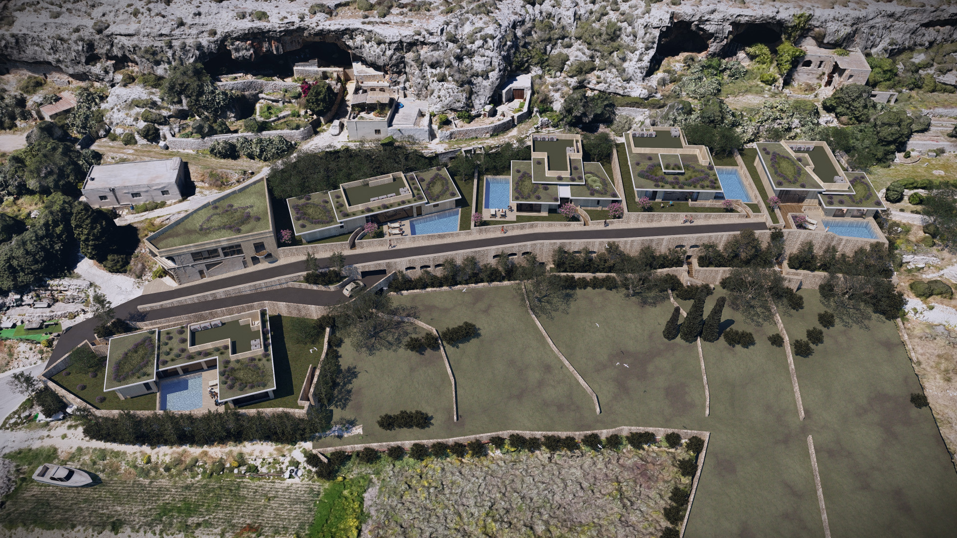 The basement level has been thoughtfully designed with a drive through, two car garage, a convenient WC and ample space for all the services together On the lower level, an agricultural store leads out onto an amazing lower 1120sqm garden which will be home to Olive trees, Aleppo pine trees, Judas and Cypress trees, Prickly Pears and shrubs.