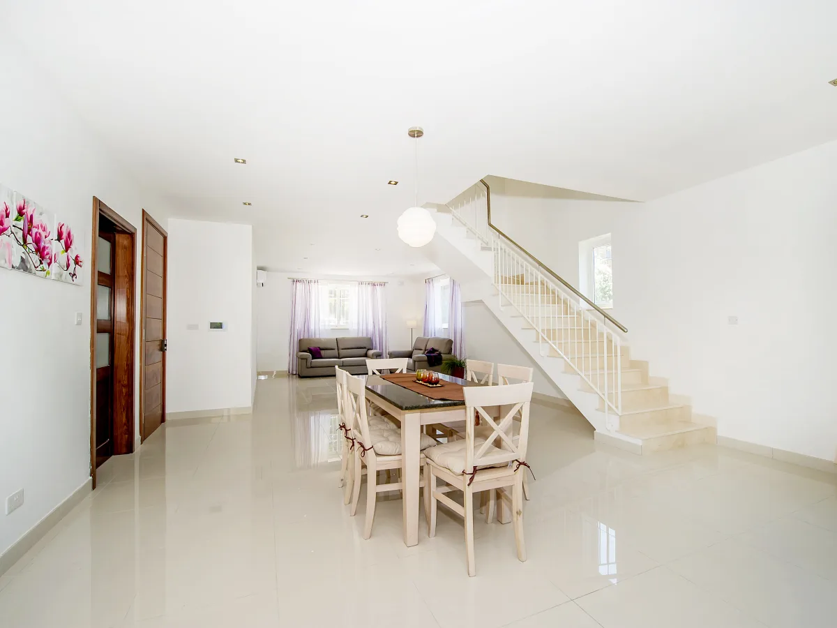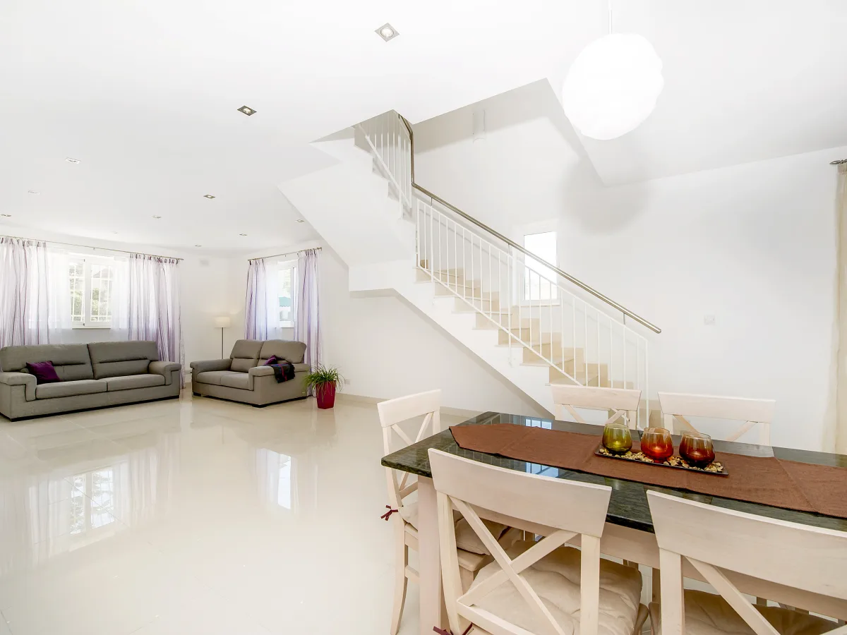 The kitchen, equipped with all main appliances, faces the BBQ terrace. A separate dining room connects the kitchen and living area, and a second, more formal dining space is accessible via a contemporary light weight staircase. Practical additions include a utility room with a washing machine, a one-car garage and a two-car drive-in.