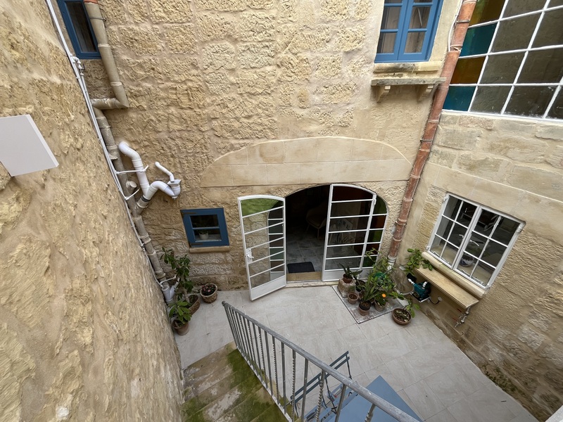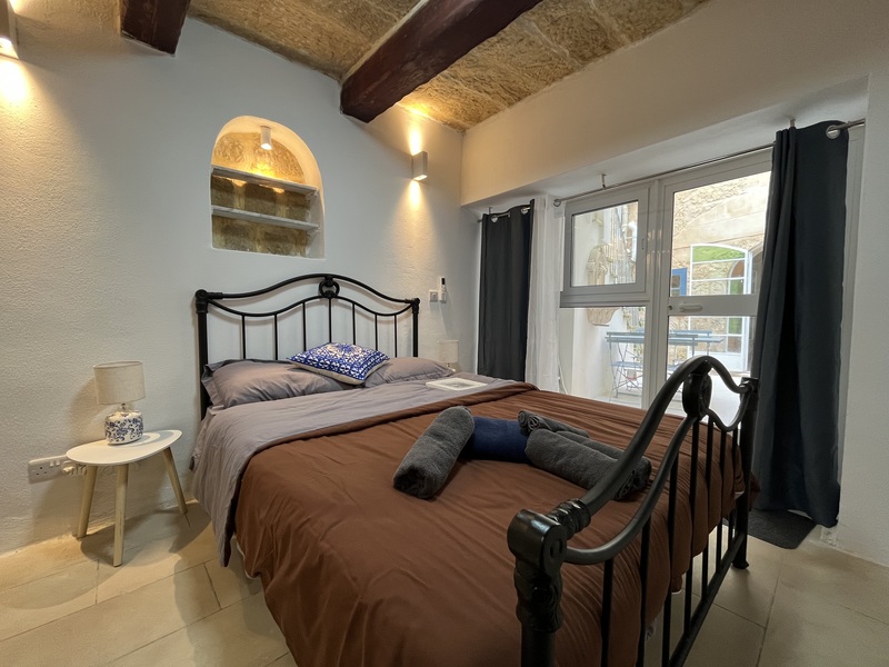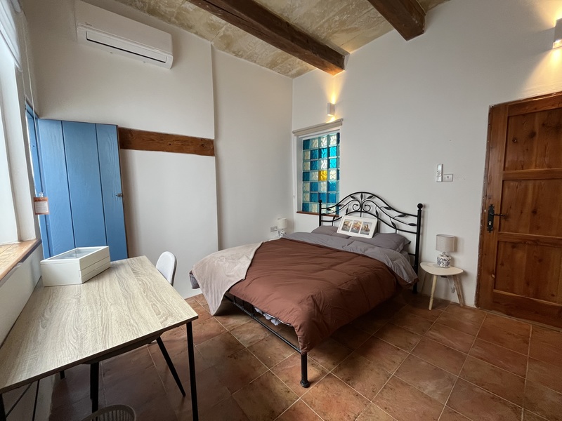 The property features a welcoming entrance leading to an internal courtyard, a dedicated washroom, a separate and comfortable open plan kitchen, living and dining area, a guest bathroom, a small backyard with a functioning fountain, and a double bedroom with a private en-suite and dedicated workspace.