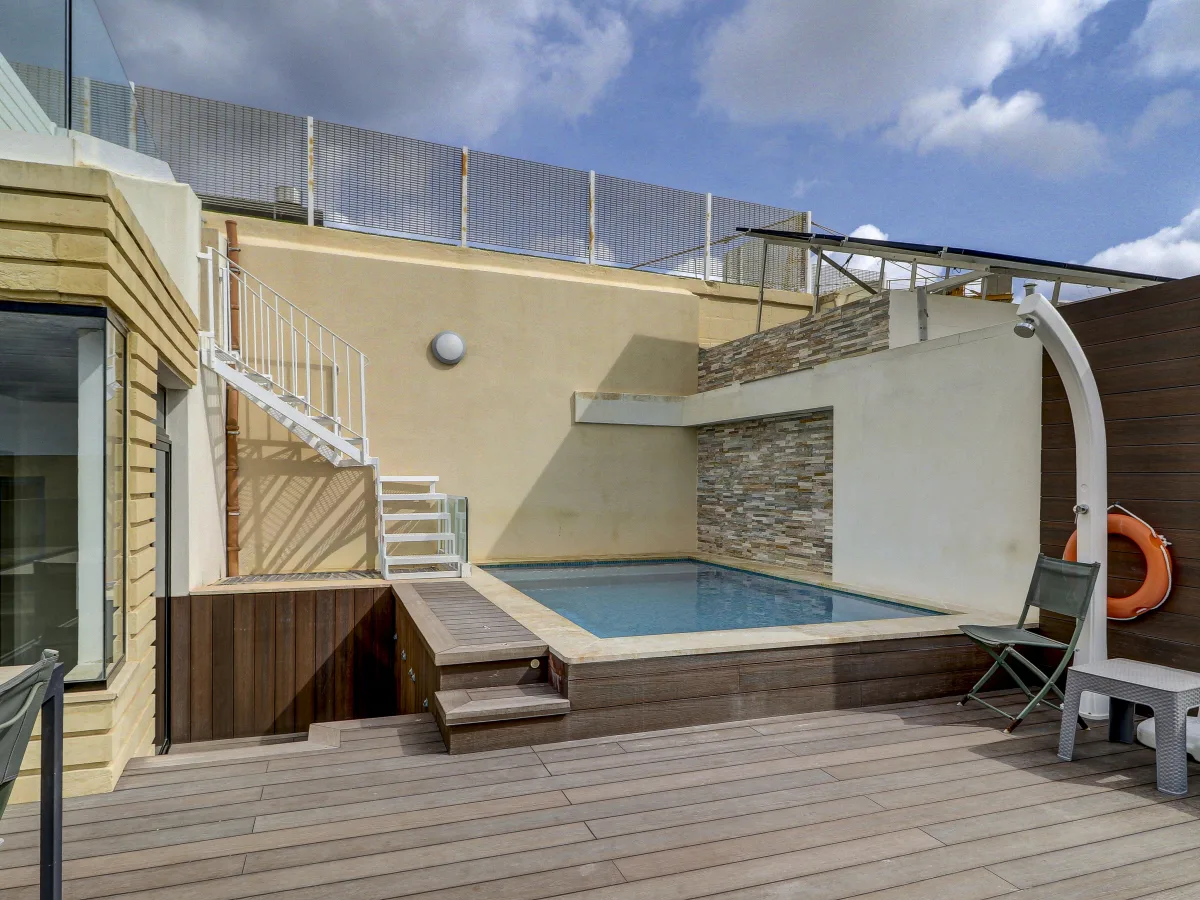 The roof level is designed for relaxation and leisure, featuring a kitchenette, pool area, and a large sun terrace with bbq enjoying panoramic views across to Valletta and the open sea, perfect for entertaining or unwinding in complete privacy.