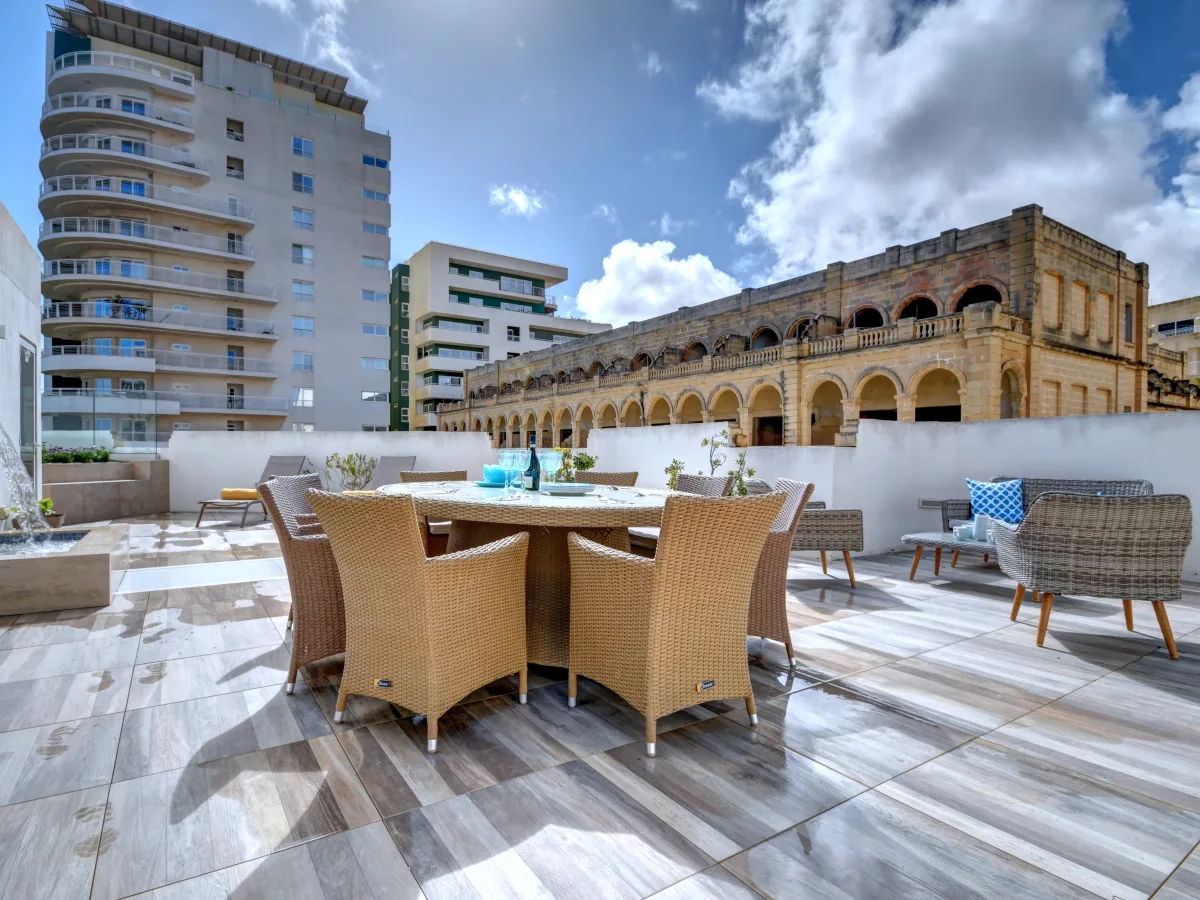Venture up to the roof level to uncover an additional fully equipped kitchen, shower bathroom, and an expansive 115 sqm roof terrace. Here, you'll revel in breathtaking views of the Mediterranean Sea, while enjoying the comforts of a lounge area, water feature, and jacuzzi pool.