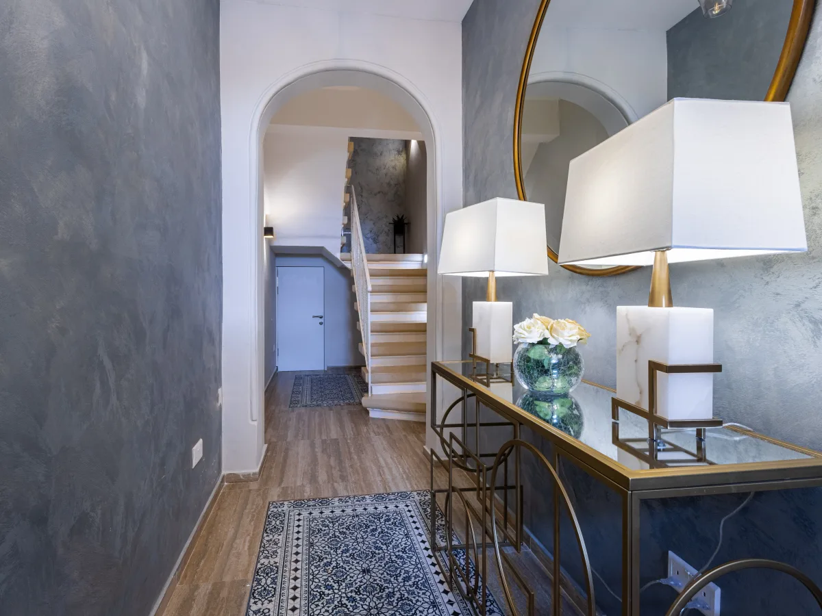 Upon entering the ground floor, one is greeted by a grand entrance, a captivating corridor adorned with elegant details, a masterfully crafted staircase, and a discreet storage area.