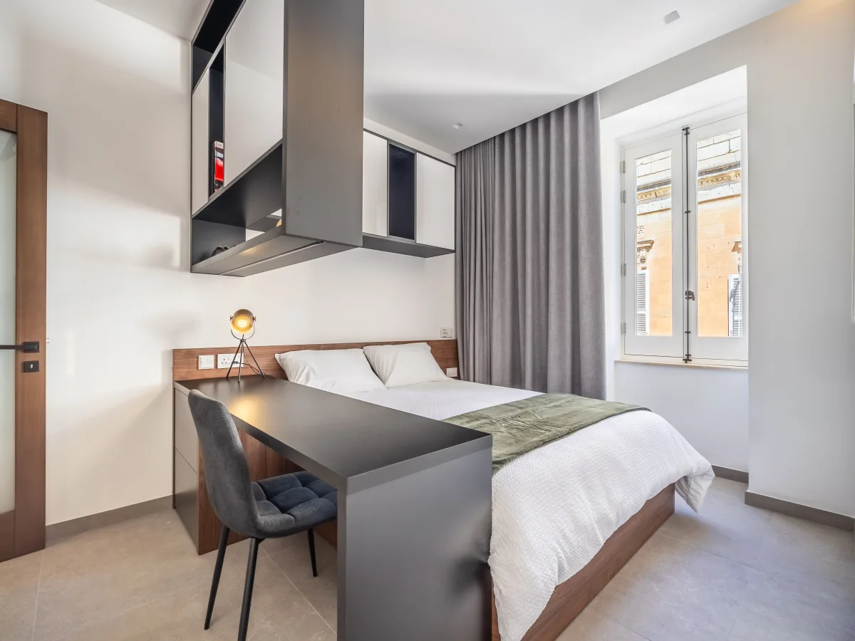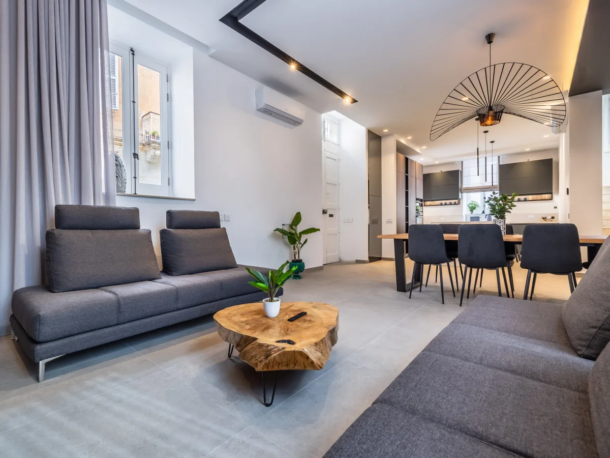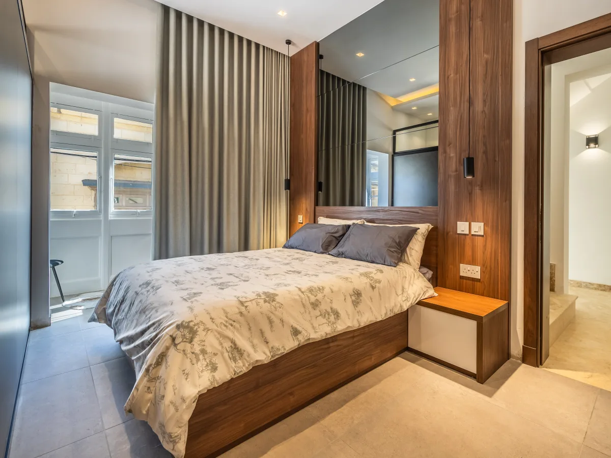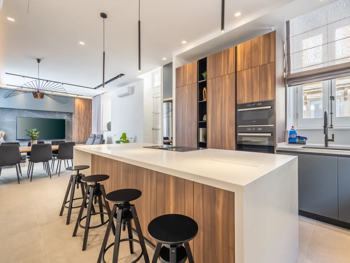 On the lower level, there's a spacious office with a small courtyard and restroom, boasting a separate entrance but also connected internally to the rest of the house. Accessed from the street above, the ground floor features a spacious interconnected kitchen, living, and dining area. Moving up the main staircase, the first-floor hosts three generously sized bedrooms with bespoke furnishings. Two of these bedrooms have their own en-suite facilities, while a main bathroom is also situated on this level.