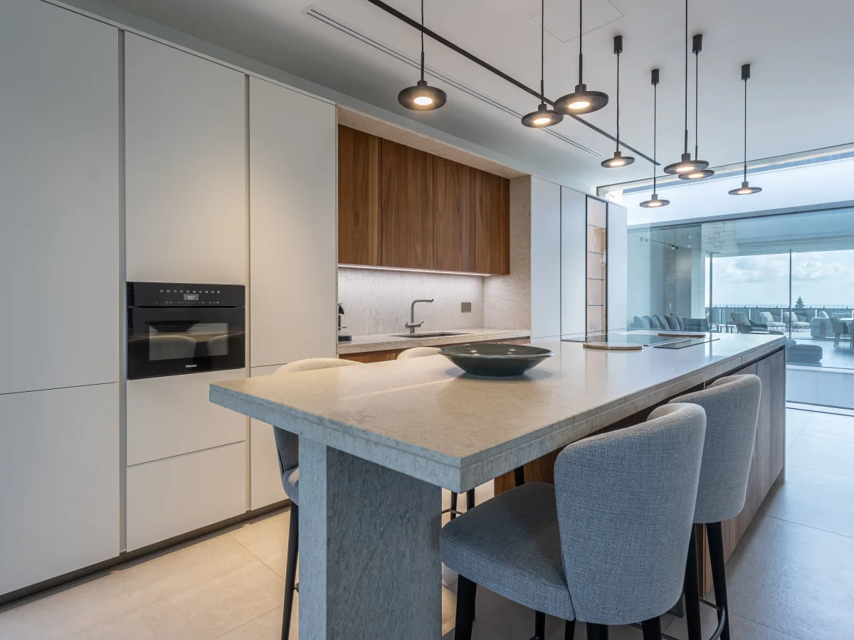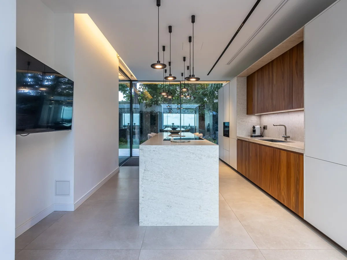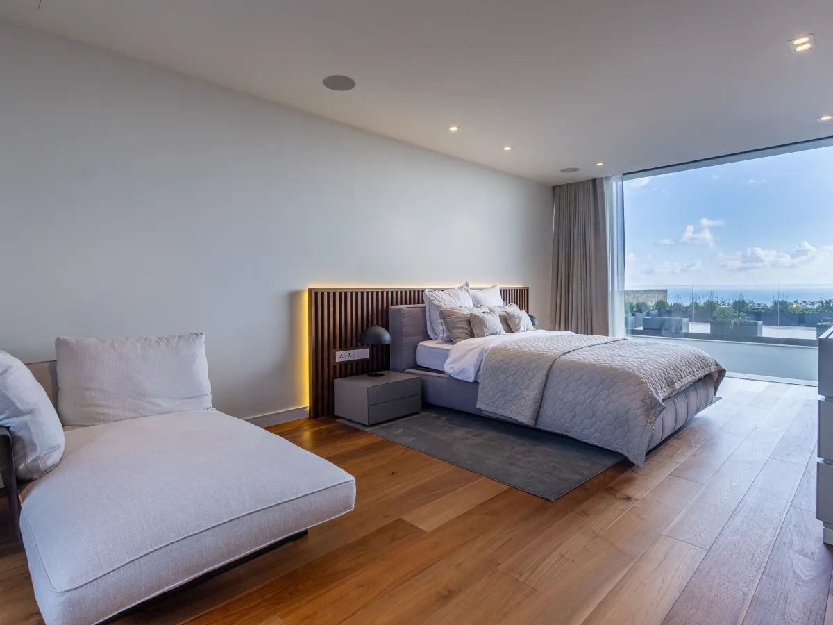 The villa’s contemporary façade, defined by clean lines and balanced proportions, sets the tone for the sophisticated interiors within. A grand sense of openness defines the main living area, where expansive glazing floods the space with natural light and blurs the boundaries between indoors and out. The open-plan kitchen, dining, and lounge area extends effortlessly onto a large terrace, an ideal setting for elegant entertaining or tranquil relaxation beside the heated swimming pool, overlooking the sea and skyline beyond.