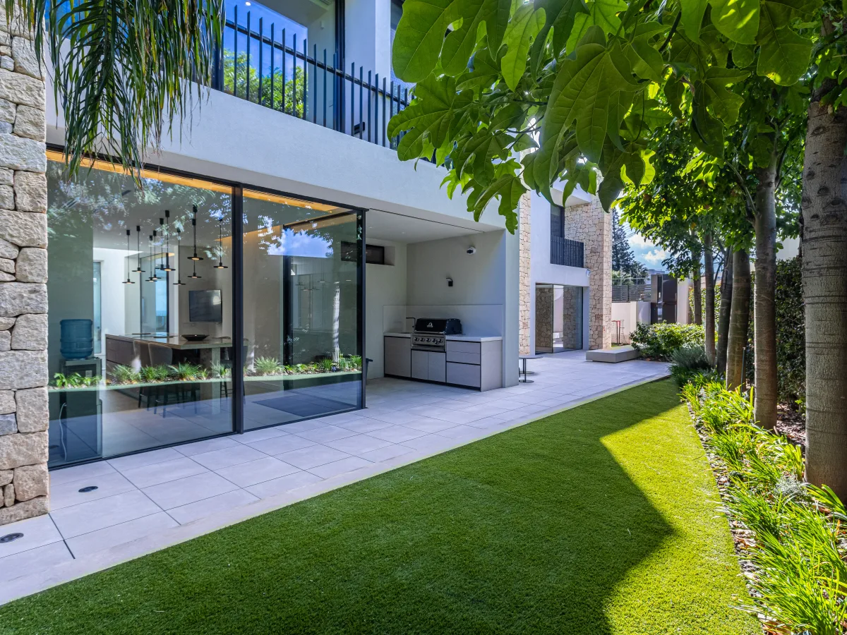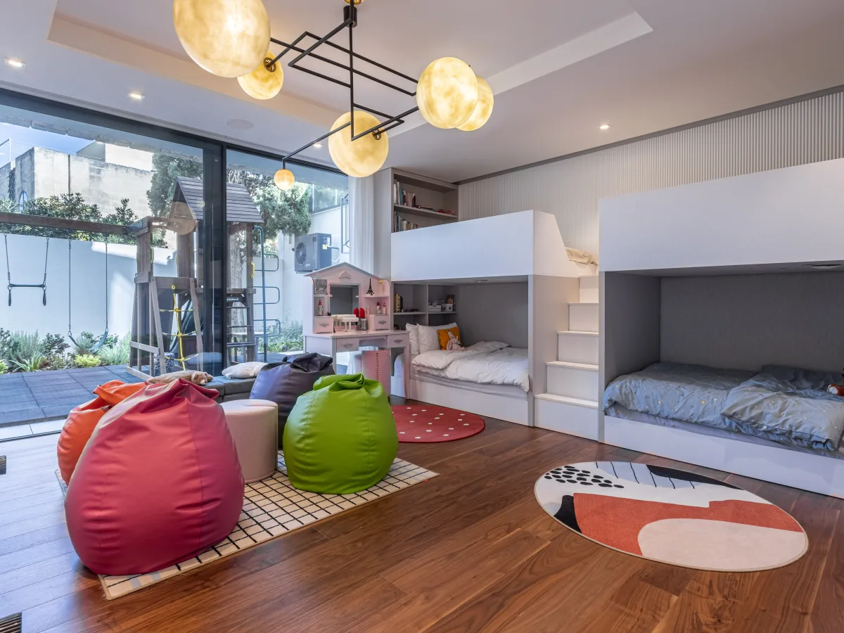 The lower level of the home reveals a rare collection of lifestyle amenities, including a private gym, playroom, and a substantial six-car garage equipped with EV charging. A lift services all floors, complementing the villa’s extensive smart-home technologies, from underfloor heating and solar systems to a full home sound network and energy-efficient backup generator.