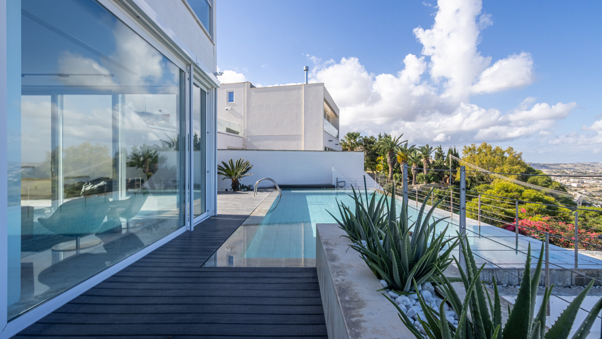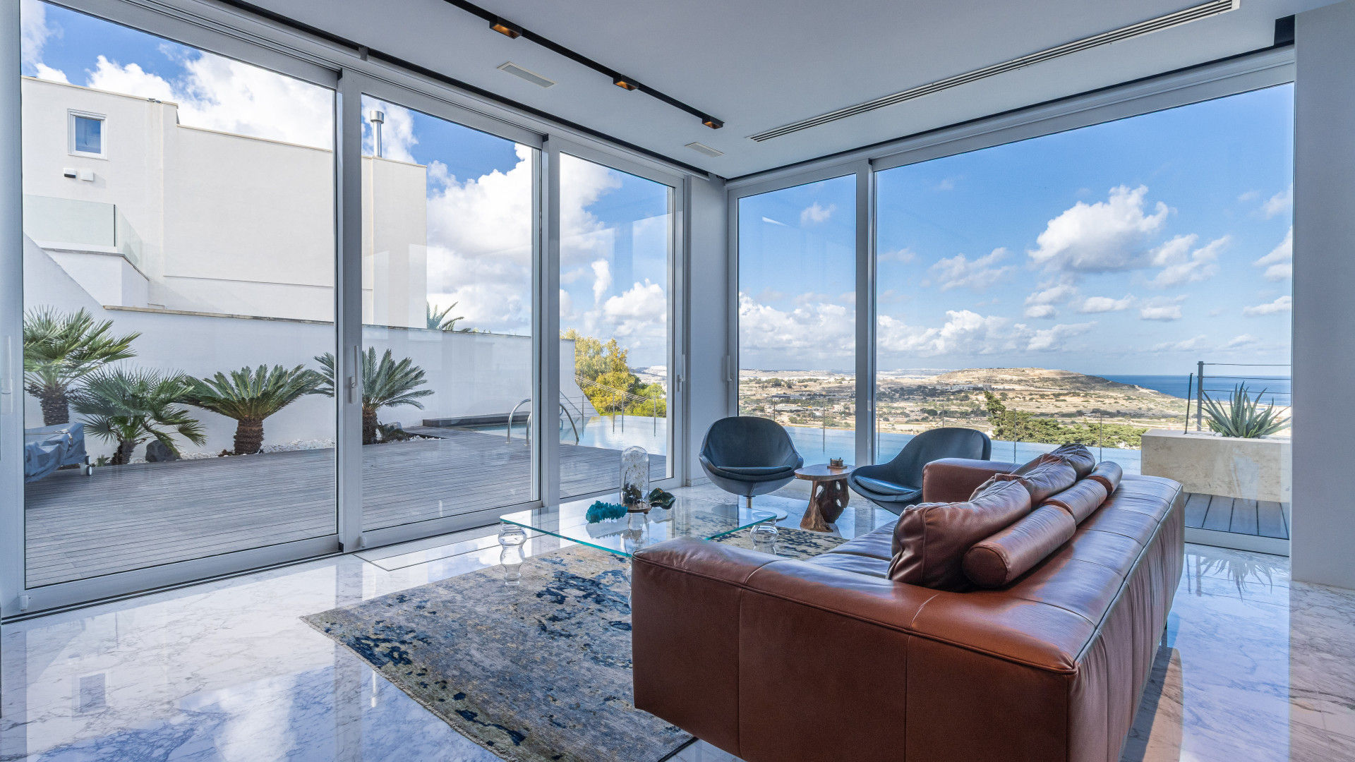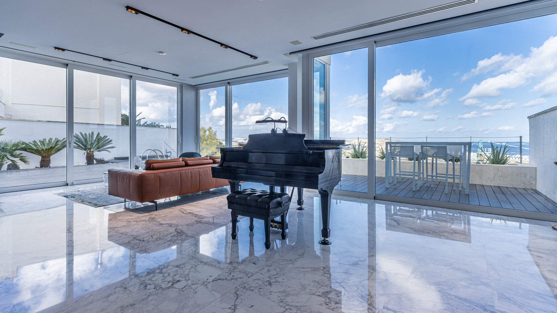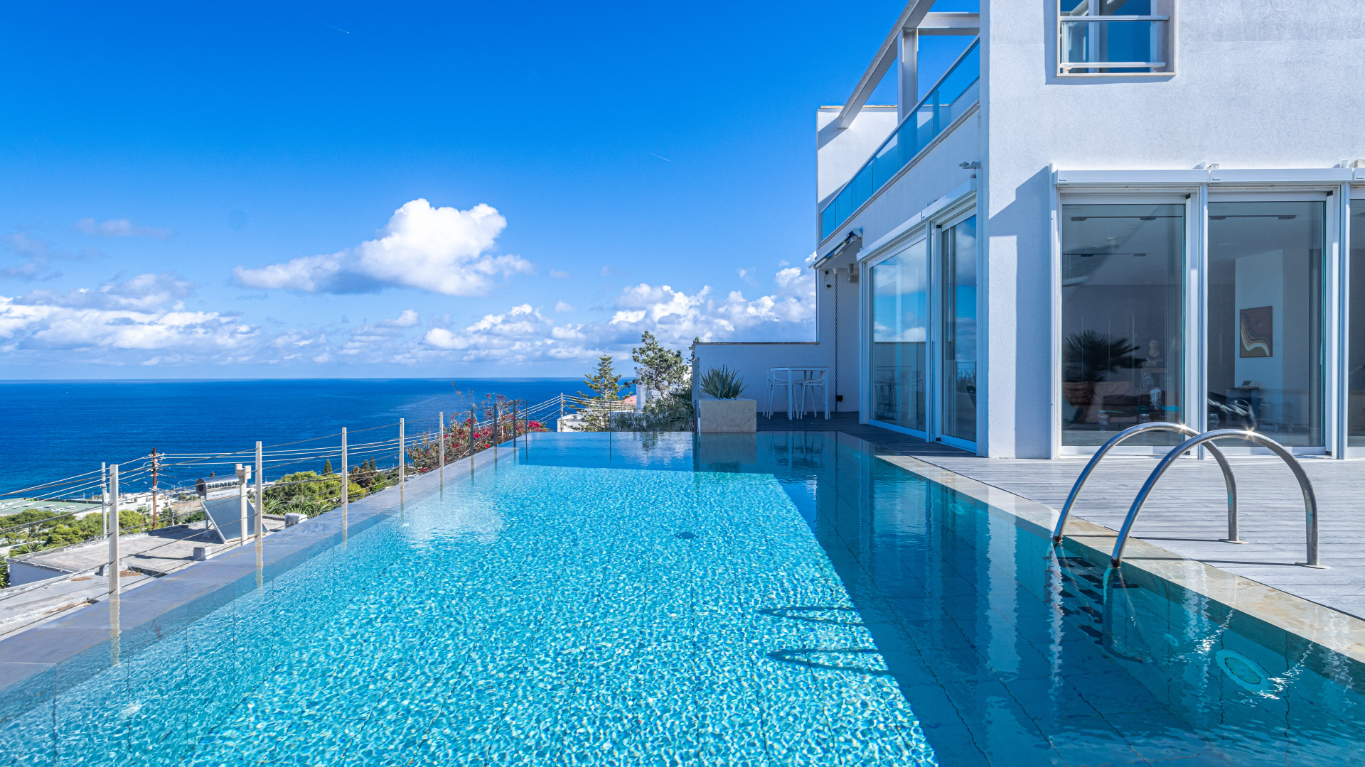 Upon entering this impressive residence through its striking single hinge swivel front door, one is immediately struck by the superior finishes and the stunning views stretching over the infinity pool, down the valley, and out to the sea. The open-plan living area, together with a newly installed, fully fitted kitchen featuring top-end appliances, overlooks the pool and spacious terrace perfect for entertaining. A separate dining area and guest powder room complete this level.