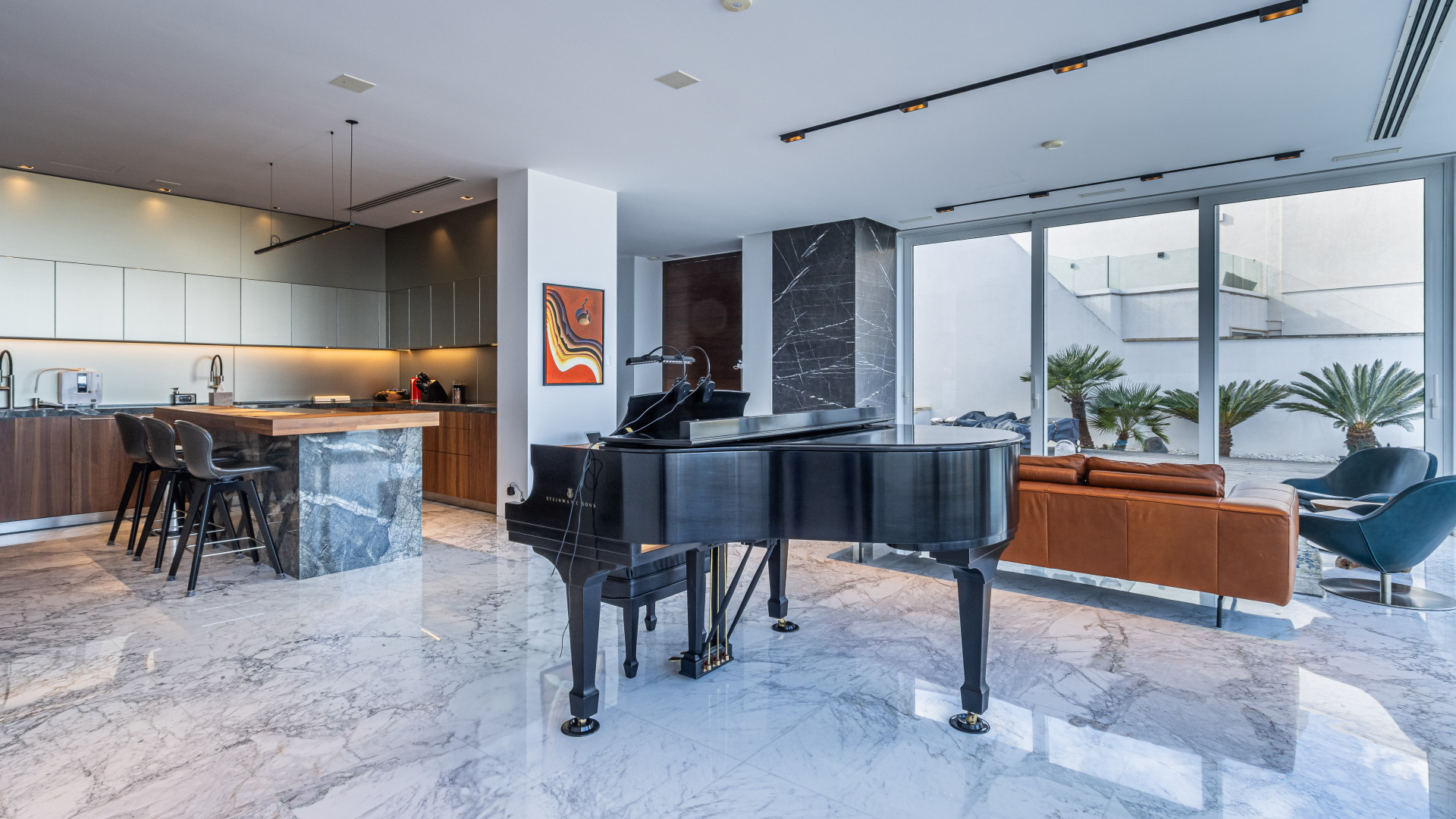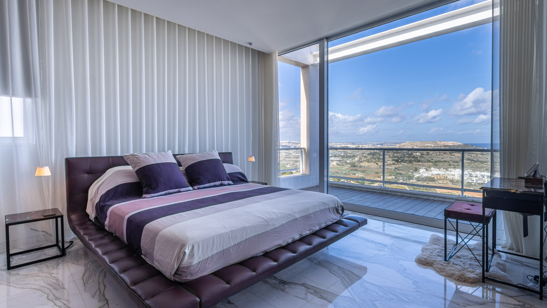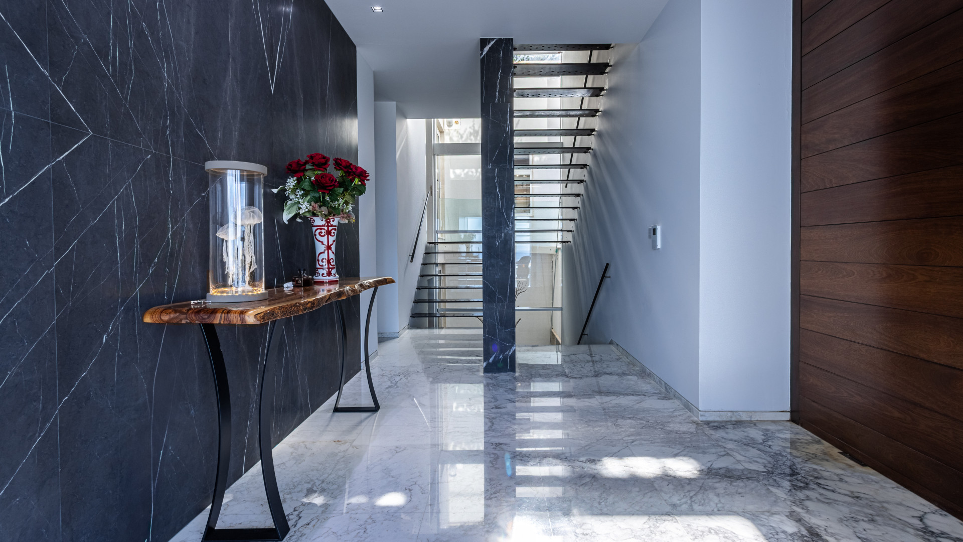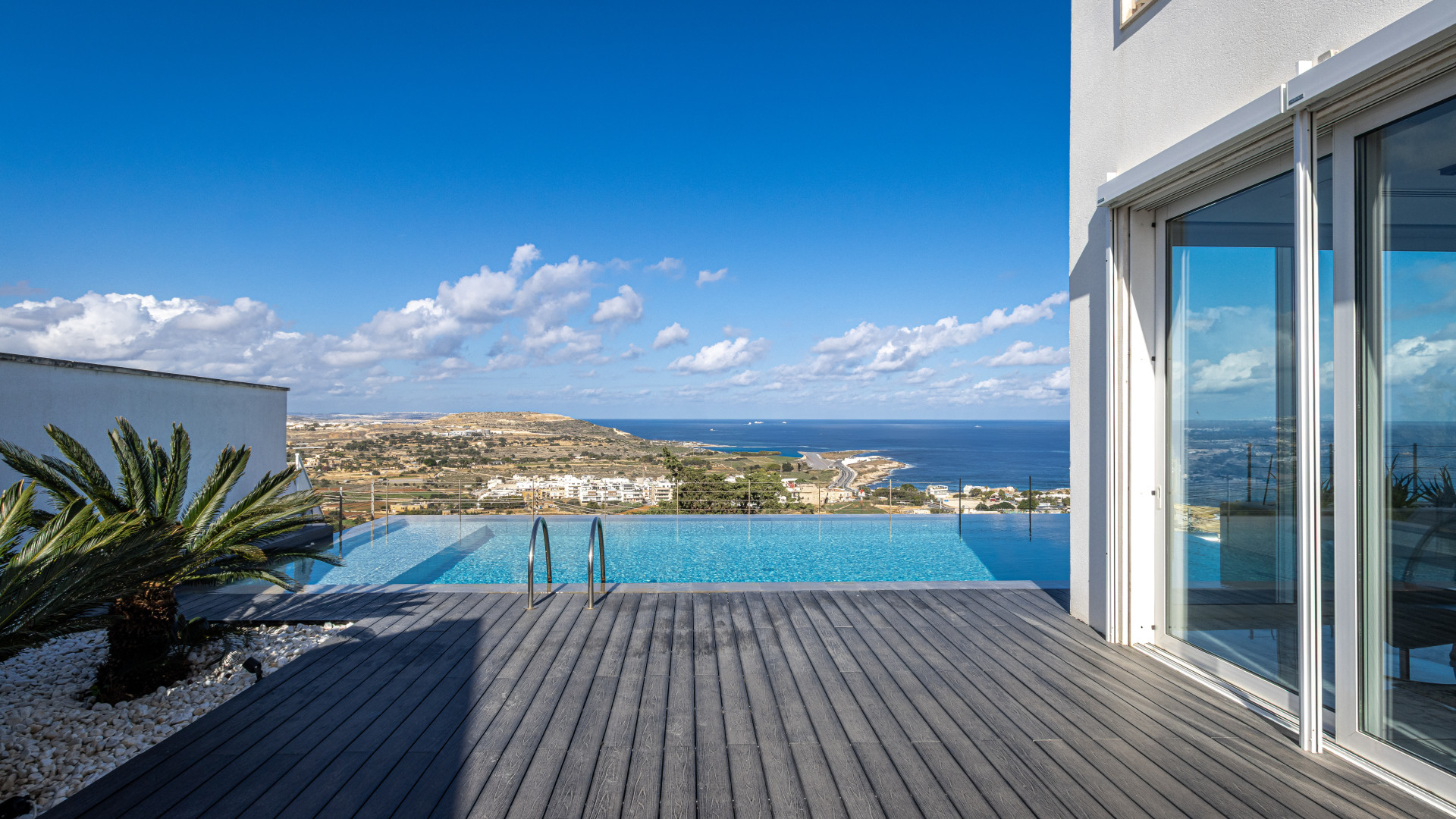 Upon entering this impressive residence through its striking single hinge swivel front door, one is immediately struck by the superior finishes and the stunning views stretching over the infinity pool, down the valley, and out to the sea. The open-plan living area, together with a newly installed, fully fitted kitchen featuring top-end appliances, overlooks the pool and spacious terrace perfect for entertaining. A separate dining area and guest powder room complete this level.