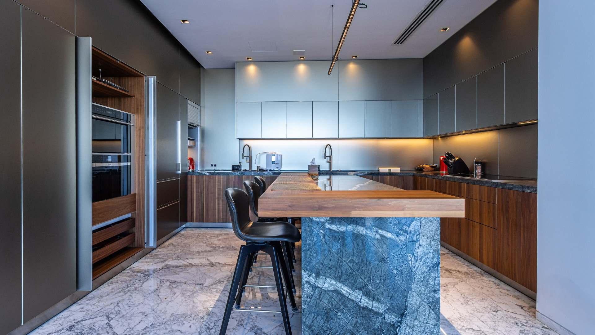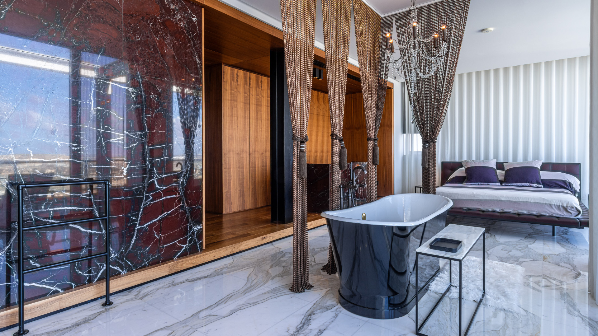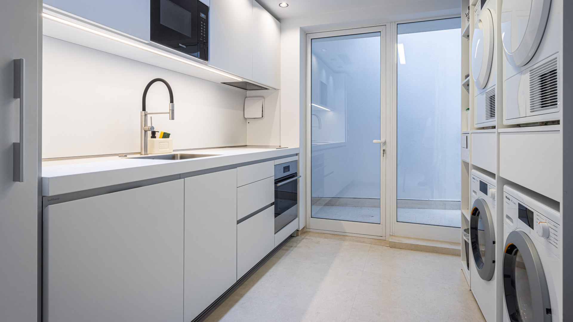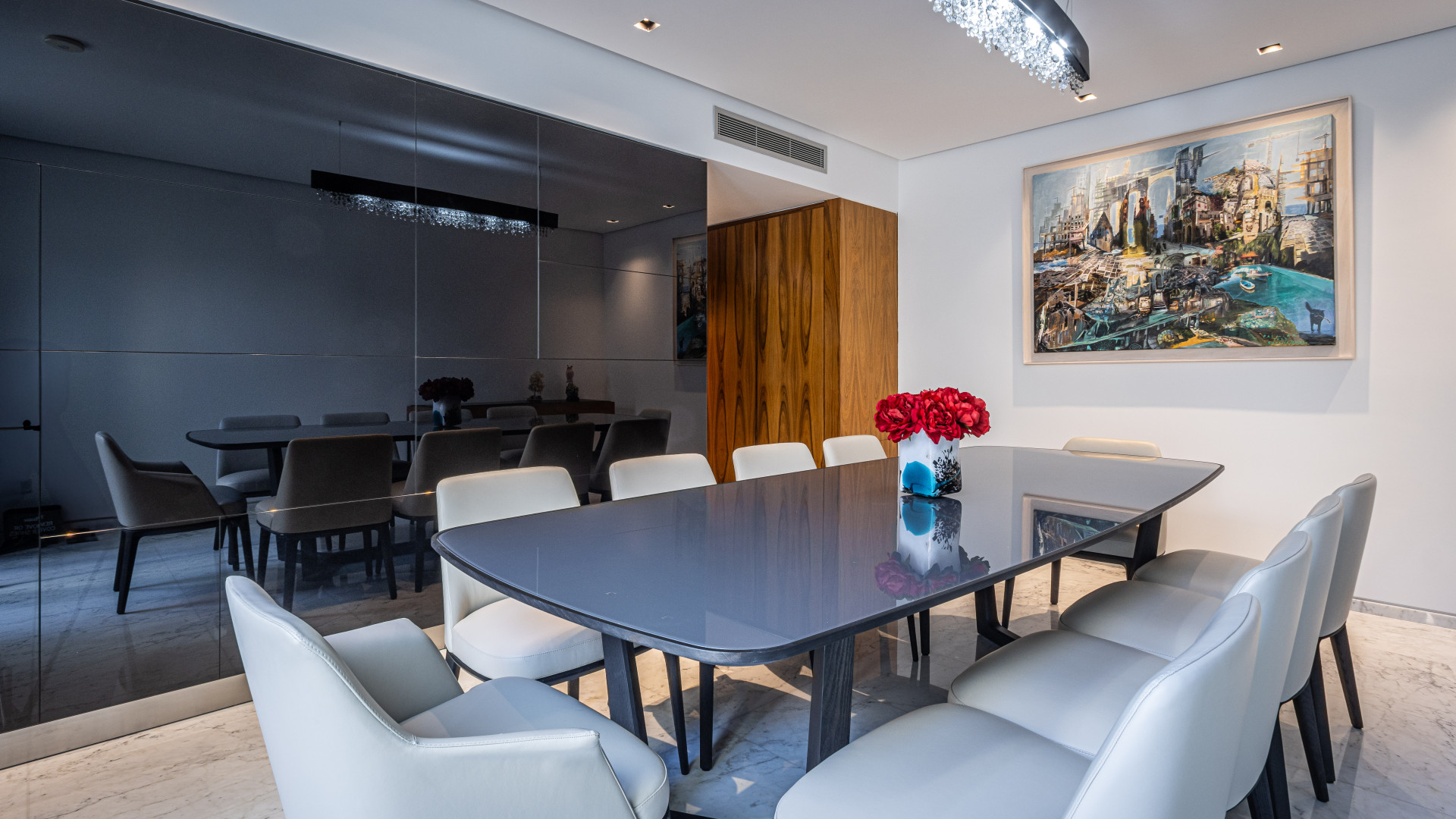 Upon entering this impressive residence through its striking single hinge swivel front door, one is immediately struck by the superior finishes and the stunning views stretching over the infinity pool, down the valley, and out to the sea. The open-plan living area, together with a newly installed, fully fitted kitchen featuring top-end appliances, overlooks the pool and spacious terrace perfect for entertaining. A separate dining area and guest powder room complete this level.