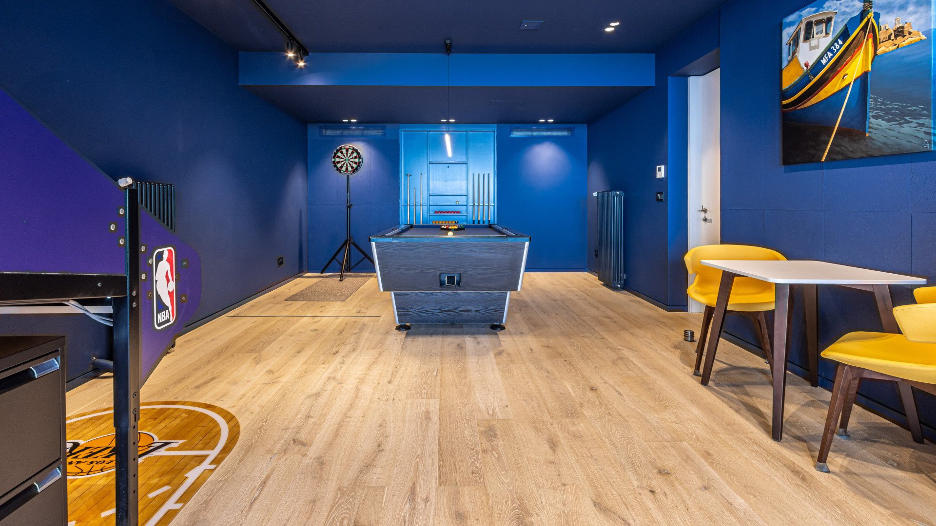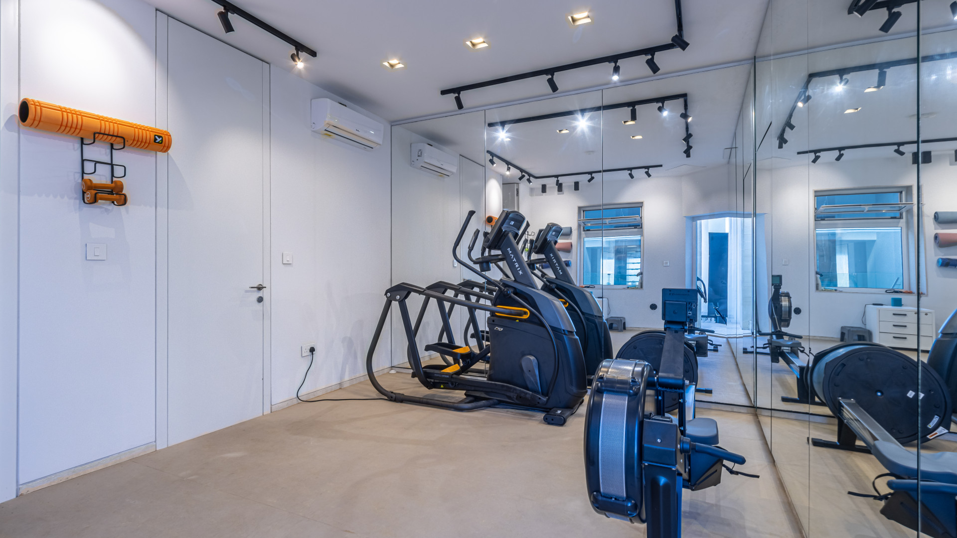 The villa comprises four bedrooms, three of which include en-suite bathrooms, as well as two additional family bathrooms and a dedicated bathroom serving the pool and gym. The lower level also features a separate kitchenette and laundry room, an impressive newly fitted cinema room, and a large games room with access to the outdoor lower terrace. The beautifully equipped gymnasium, fitted with quality equipment and mirrors, further enhances the home’s luxurious amenities.