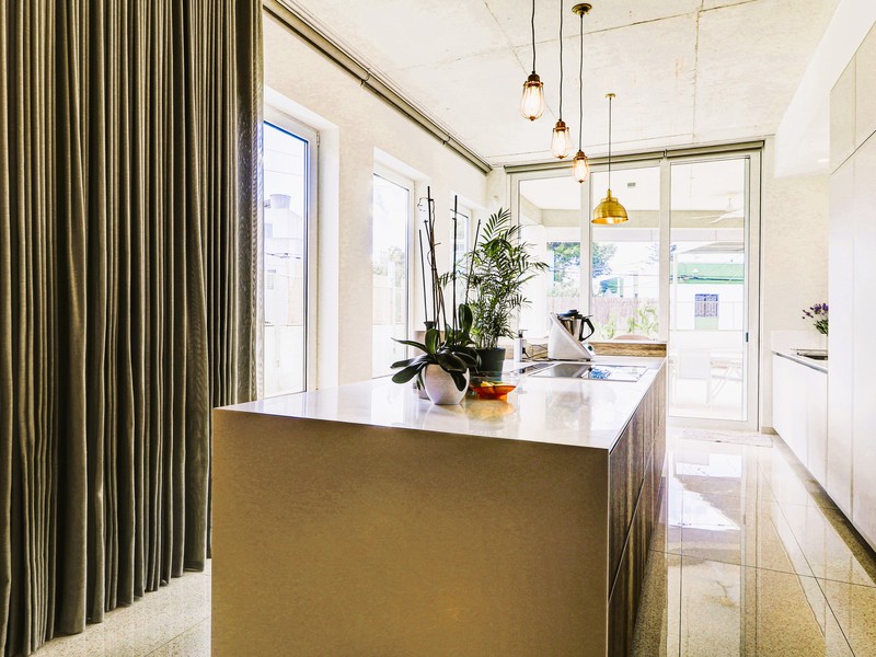 Set on a plot measuring 300 sqm, the property provides over 550sqm of internal space spread across three floors. The ground floor comprises a bright open plan kitchen, living and dining area leading directly onto a private pool and deck area, ideal for outdoor entertaining, together with a guest WC.