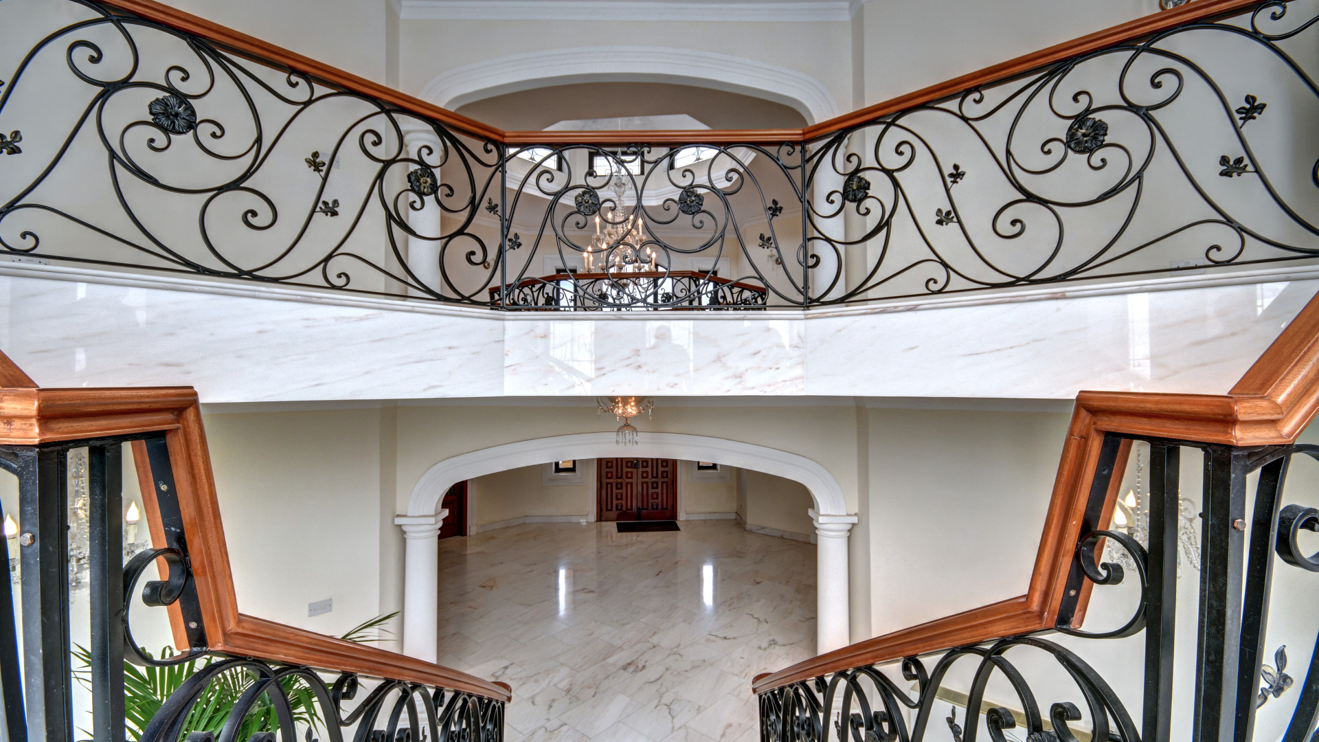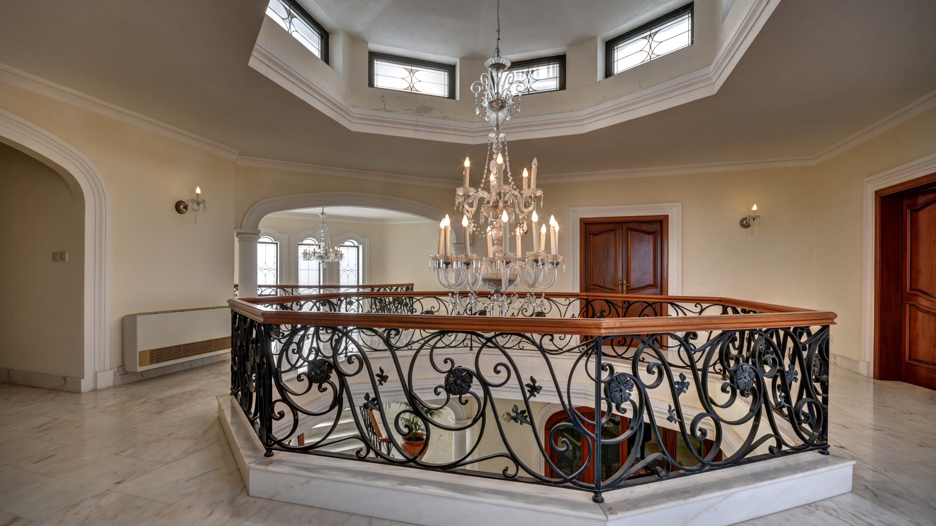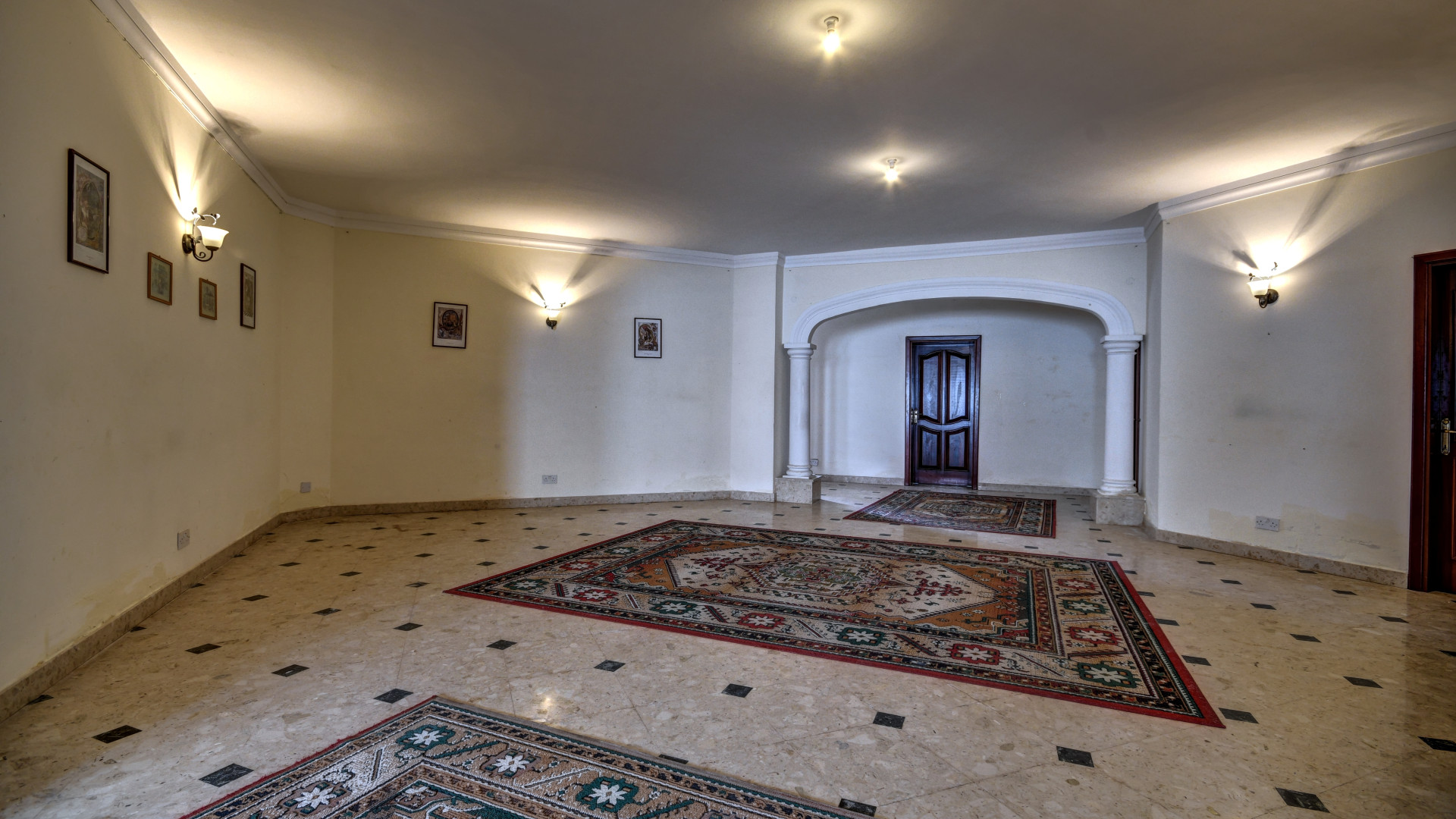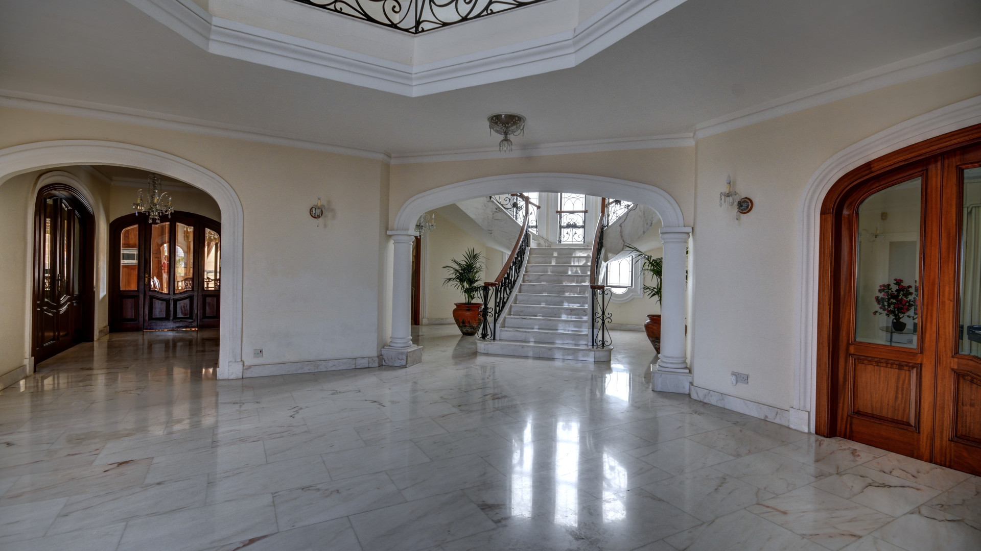 Stepping inside, one is greeted by a grand white marble reception hall, a spacious white marble lounge, a generous kitchen, an expansive dining and living room, flooded with natural light, a private study, and a guest bathroom, all complemented by a majestic marble staircase.