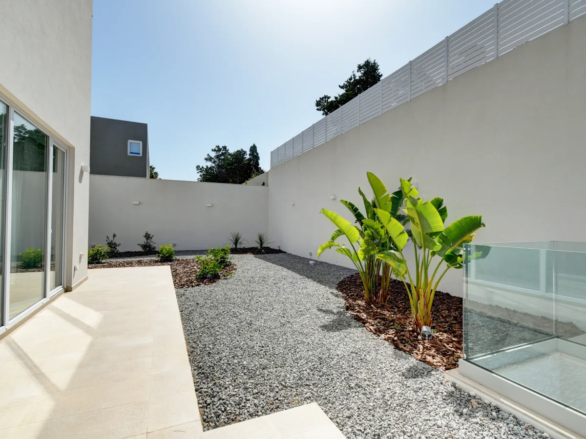 The villa boasts four double bedrooms, each with its own en-suite bathroom ensuring privacy and comfort for all occupants. An office area provides a dedicated space for work or study. The villa is surrounded by a mature garden, which allows ample natural light to flood the property, enhancing its spacious and airy feel.