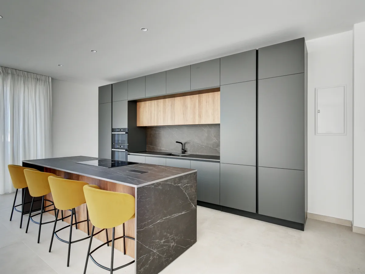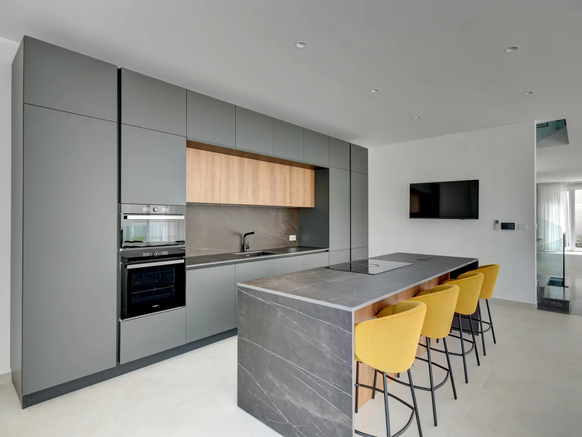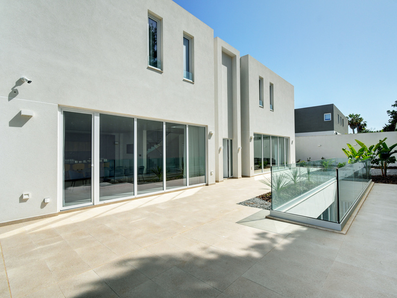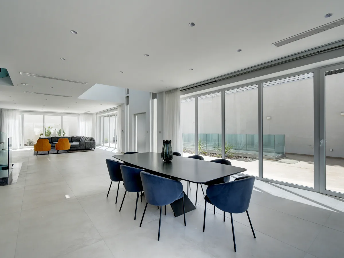 The property accommodates four double bedrooms, each with a private en-suite bathroom, ensuring maximum comfort and privacy. A dedicated office provides an ideal environment for both professional and personal use. Expansive apertures and a surrounding mature garden flood the interior with natural light and contribute to a sense of openness and tranquillity.