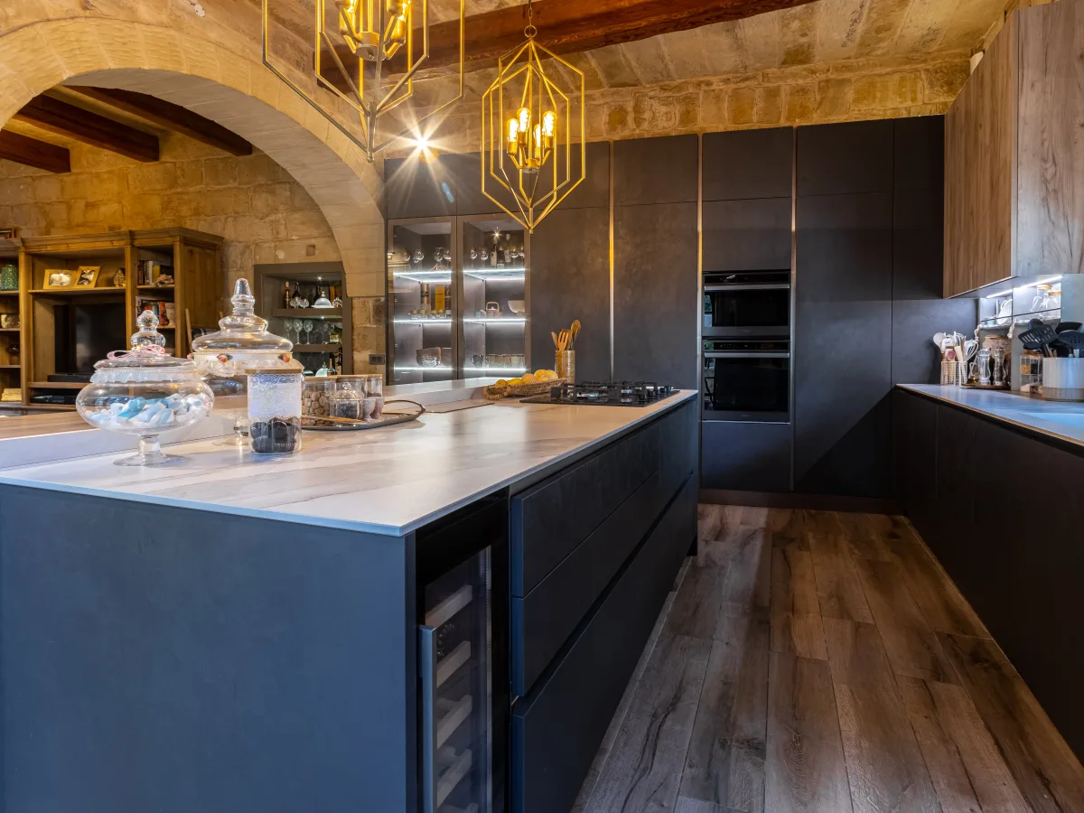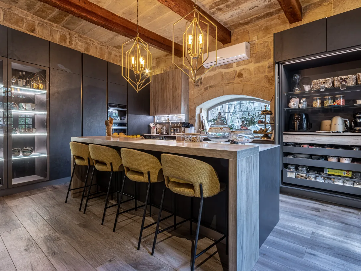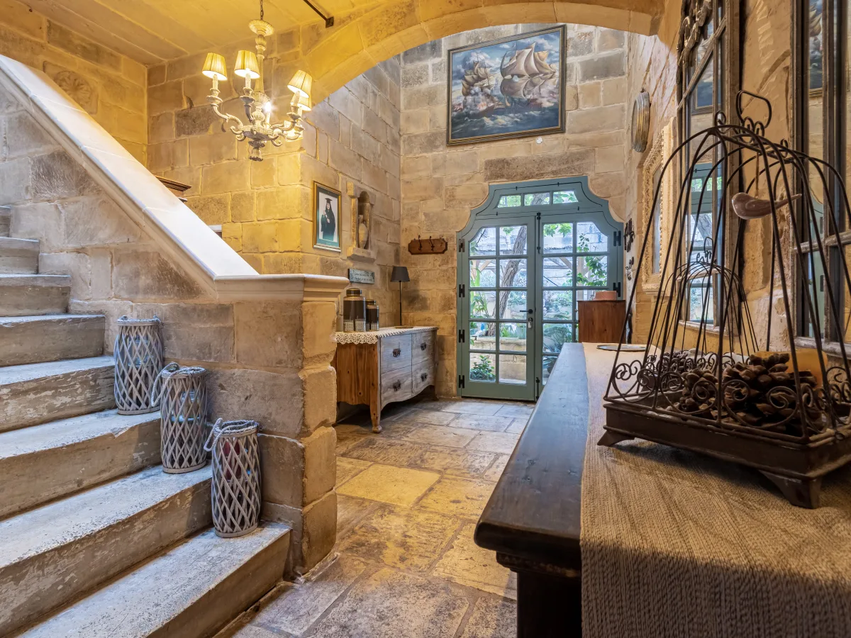 As you cross this enchanting courtyard, you'll be drawn toward the main house, a masterpiece of old architectural ingenuity. Stepping inside, you're greeted by a spacious and inviting hallway, setting the tone for what lies beyond. To your left, an impeccably designed, fully equipped modern kitchen seamlessly blends with a comfortable everyday living space. On the right, an elegant dining room and a large formal sitting room offer refined spaces for entertaining guests or enjoying intimate family moments.