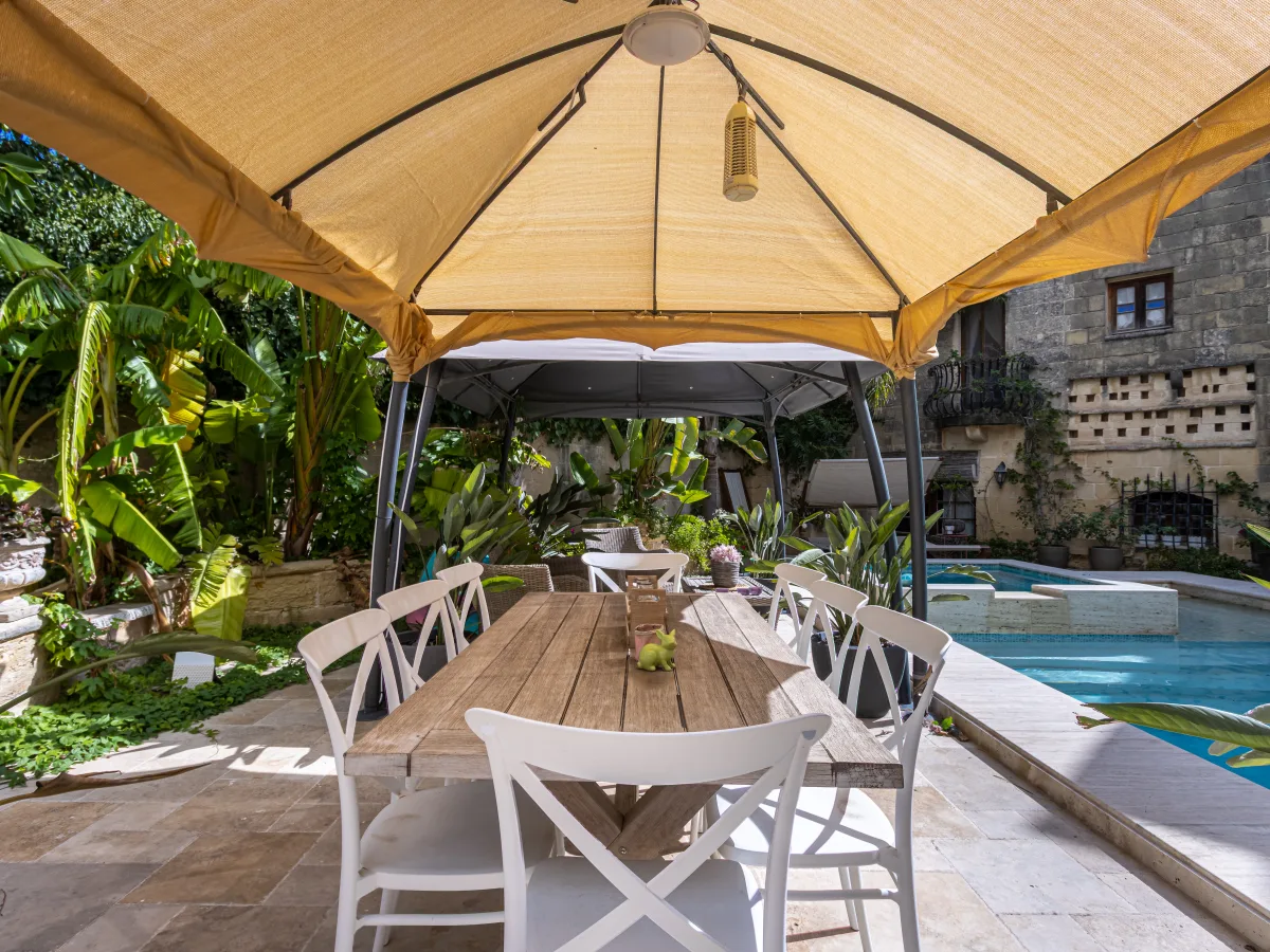 The courtyard beckons with its inviting outdoor loungers, providing the perfect spot to bask in the sun. An elegant gazebo awaits, an idyllic retreat for intimate gatherings or peaceful contemplation.