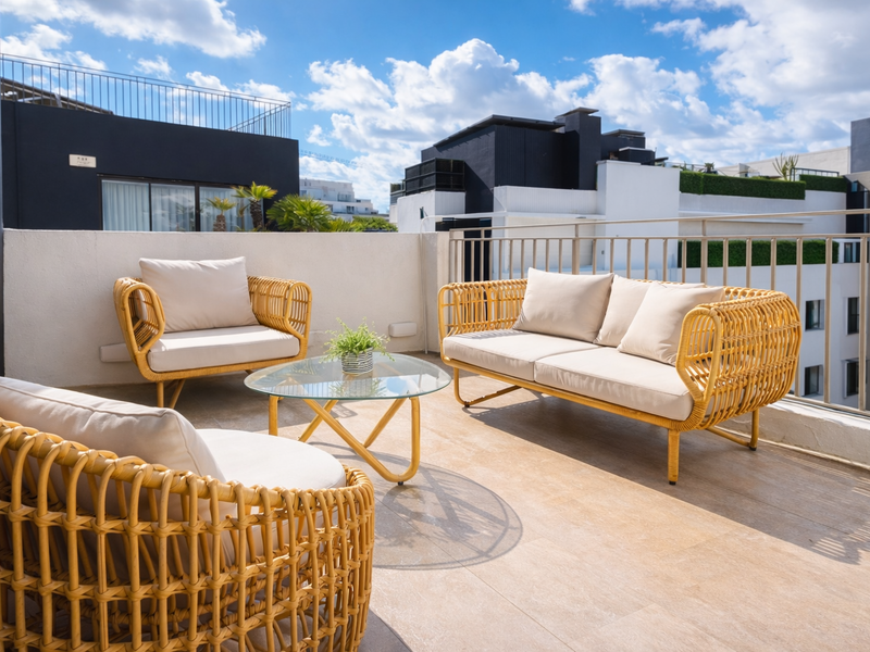 The accommodation is set over two levels and comprises a beautiful open-plan living area featuring a double height ceiling, an elegant sitting room with a wood-burning fireplace, a separate dining room, and a comfortable living area. A fully fitted kitchen and breakfast room opens onto a lovely sunny terrace, ideal for outdoor dining. This level also includes a large study, a bedroom and a guest WC.