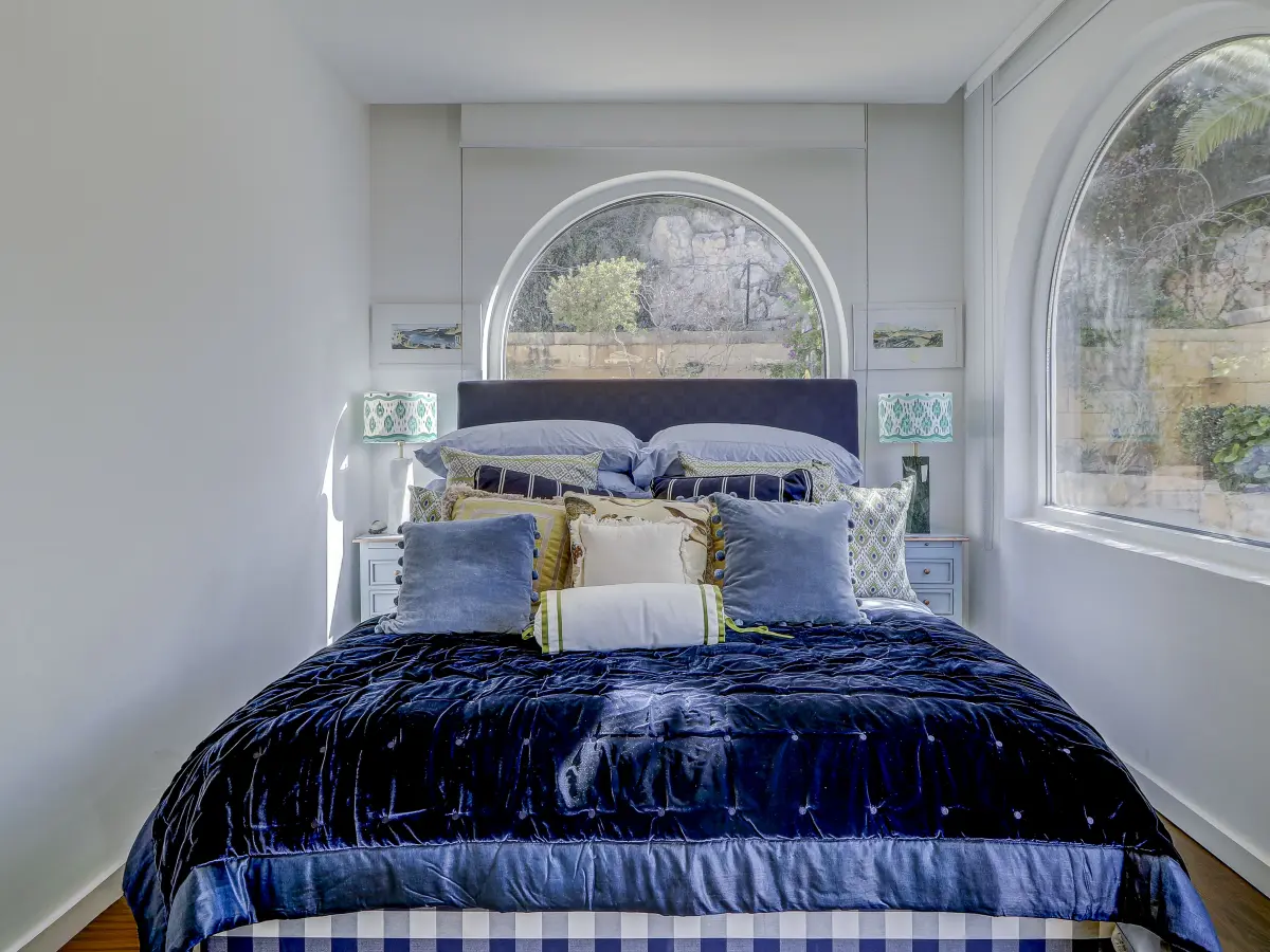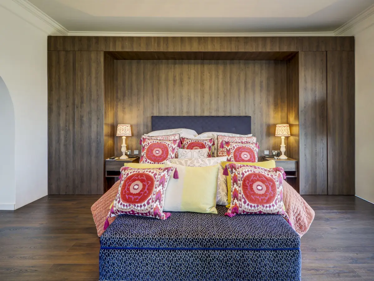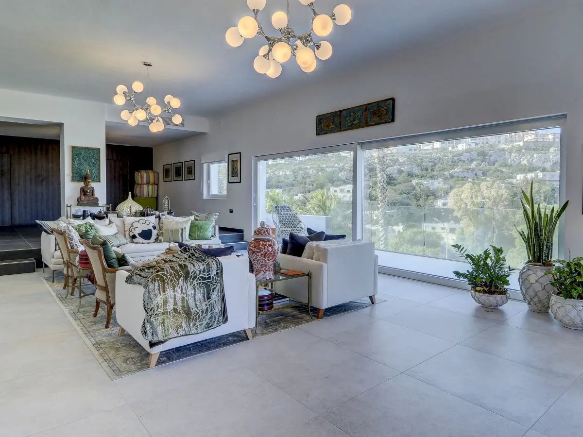 Also downstairs is a private catering kitchen, hidden behind panels, and a very large guest bathroom with a rainfall shower. Upstairs, the property is carpeted, perfect for keeping cozy and warm during the few cooler winter months. The bedrooms are all very well sized, each having splendid views, either over the front of the property towards the sea, or focusing on the landscaped gardens, courtyard, and cliff at the back of the property, two of which have en-suites. The master bedroom suite has a lounge with an open fireplace and access to a large deck overlooking the terrace and gardens below and onto the stunning views one finds living in Santa Maria Estate. It is exceptionally styled and sized, perfect for having one’s own private space, for reading, meditation, relaxation or a quiet drink. The bedroom has a large en-suite with a separate walkthrough closet, all with stunning views and ample light. This truly is a stunning property, designed by the owners for themselves with no expense spared and it is obvious, with their heart and soul poured into it. A definite must see and a one of a kind home.