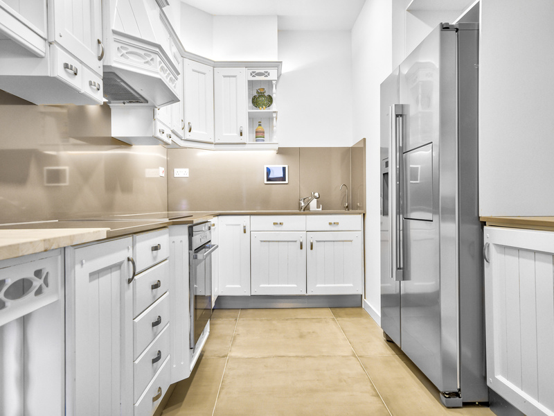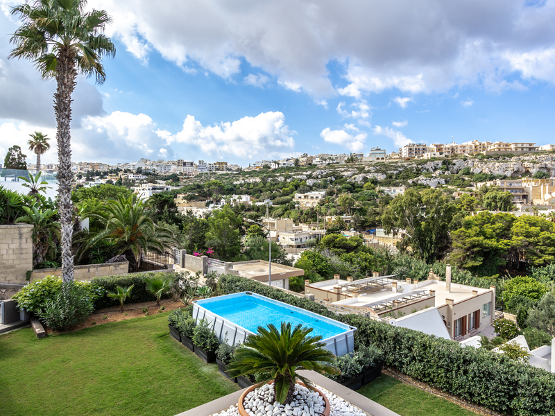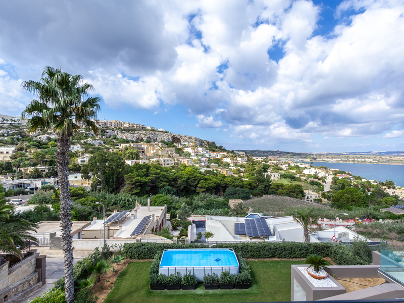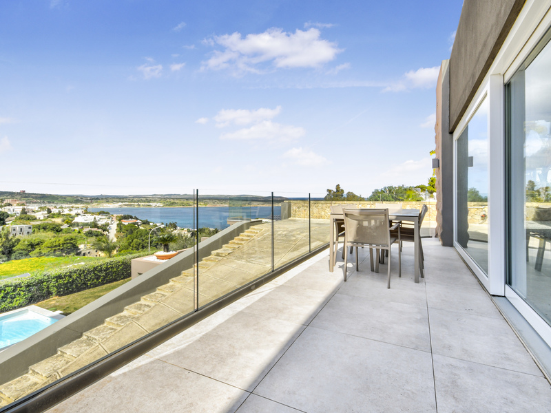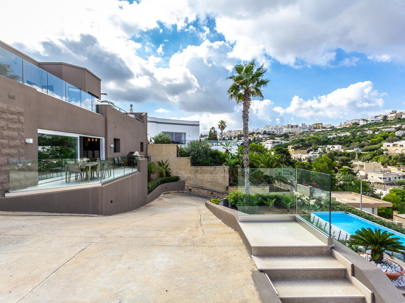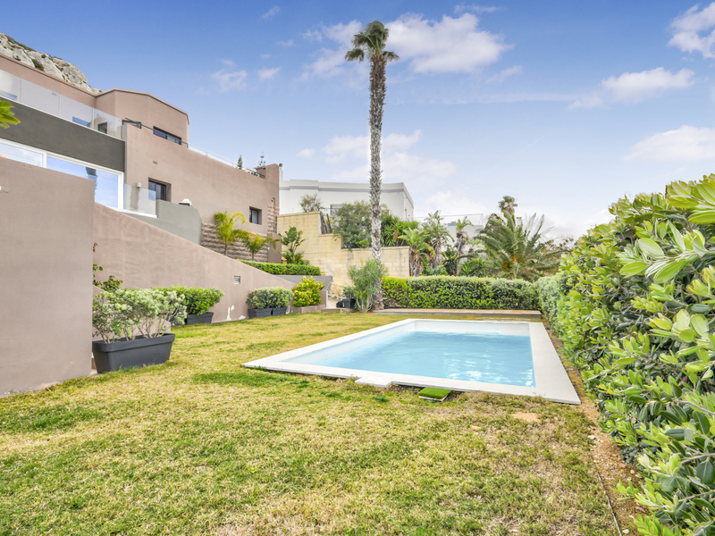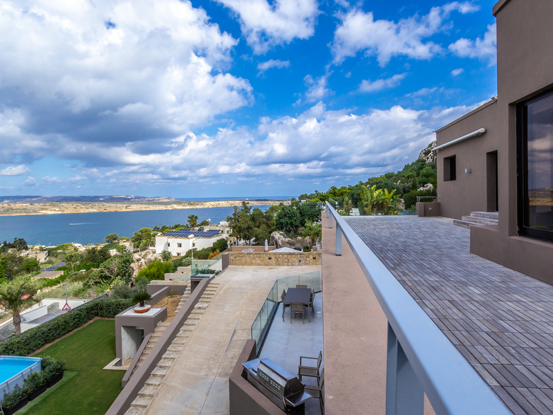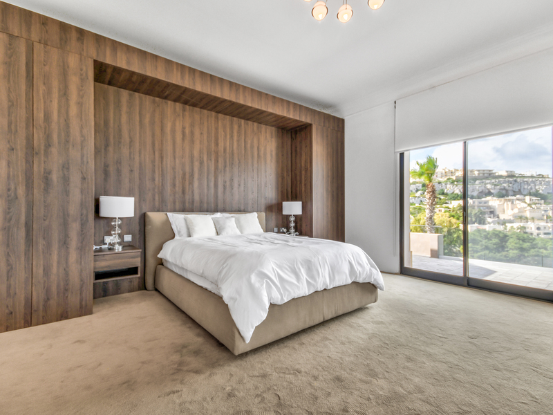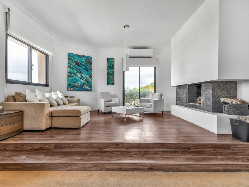 Inside there is a large dining table, a designer chef’s kitchen, and a preparation area. Just off the entertainment space is a large living area, with ample seating for guests to relax in front of the TV. Behind the kitchen, seen through an internal glass window is a wine cellar, fashioned in the style of a natural rock cave which will be the envy of any friends who enjoy and understand wines. Also downstairs is a private catering kitchen, hidden behind panels, and a very large guest bathroom with a rainfall shower. Upstairs the property is carpeted, perfect for keeping cozy and warm during the few cooler winter months. The bedrooms are all very well sized, each having splendid views, either over the front of the property towards the sea, or focusing on the landscaped gardens, courtyard and cliff at the back of the property, two of which have en suites. The master bedroom suite has a lounge with an open fireplace and access to a large deck overlooking the terrace and gardens below and onto the stunning views one finds living in Santa Maria Estate. It is exceptionally styled and sized, perfect for having one’s own private space, for reading, meditation, relaxation or a quiet drink. The bedroom has a large en-suite with a separate walkthrough closet, all with stunning views and ample light. This truly is a stunning property, designed by the owners for themselves with no expense spared and it is obvious, with their heart and soul poured into it. A definite must see and a one of a kind home.
