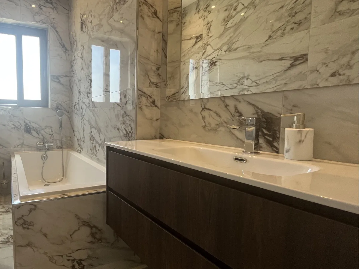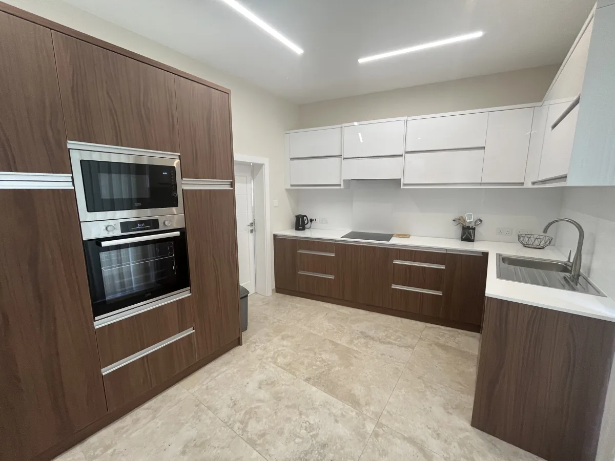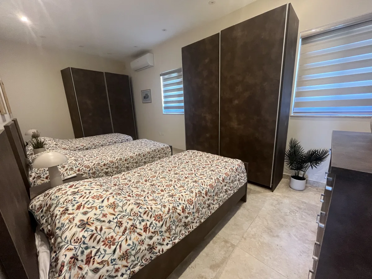 The ground floor comprises a fully equipped kitchen with an adjoining pantry and washroom, a combined formal living and dining area, a bathroom, and a double bedroom. The upper floor accommodates four additional double bedrooms, each fitted with air conditioning units for year round comfort.