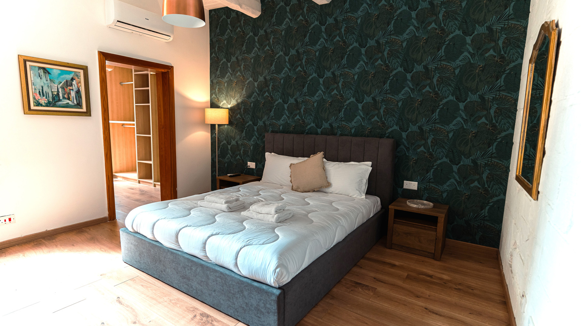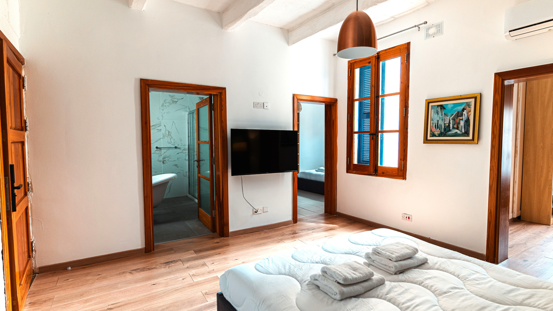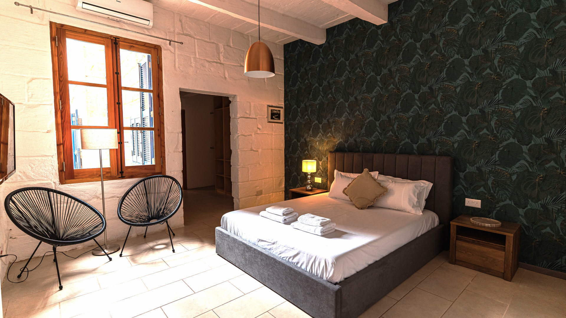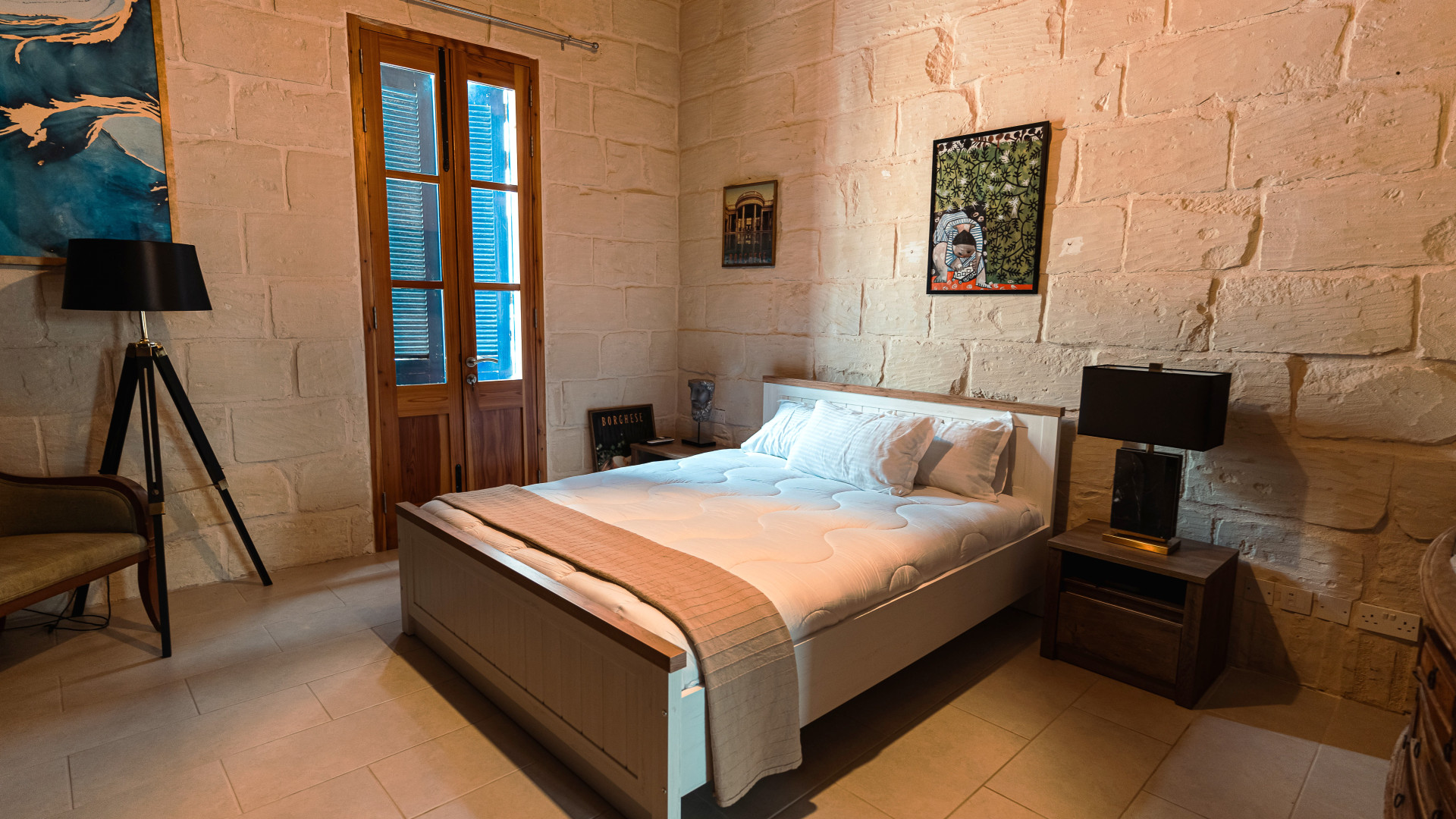 This exceptional property spans four floors, each boasting lofty ceilings, ancient wooden beams, and characteristic Maltese tiles. The ground floor hosts a private bedroom enclave with an ensuite bathroom, accessible via a spiral staircase to the first floor.