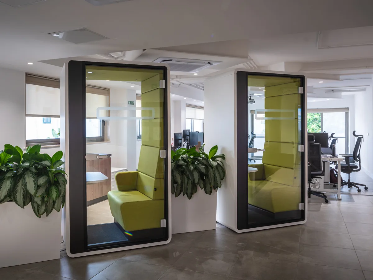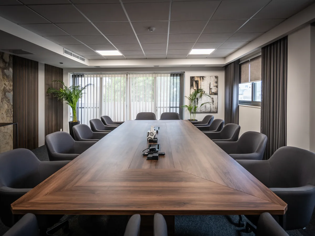 Flooded with natural light through large apertures, the office also offers multiple outdoor spaces, including a wrap around yard. Thoughtfully designed amenities include bathrooms with showers and a spacious, fully equipped kitchen, complete with a dishwasher, fridge freezers, and an extensive seating area that can be expanded for outdoor use. All apertures come fitted with insect screens and blinds, while the boardroom benefits from sound-absorbing features for enhanced privacy and efficiency.