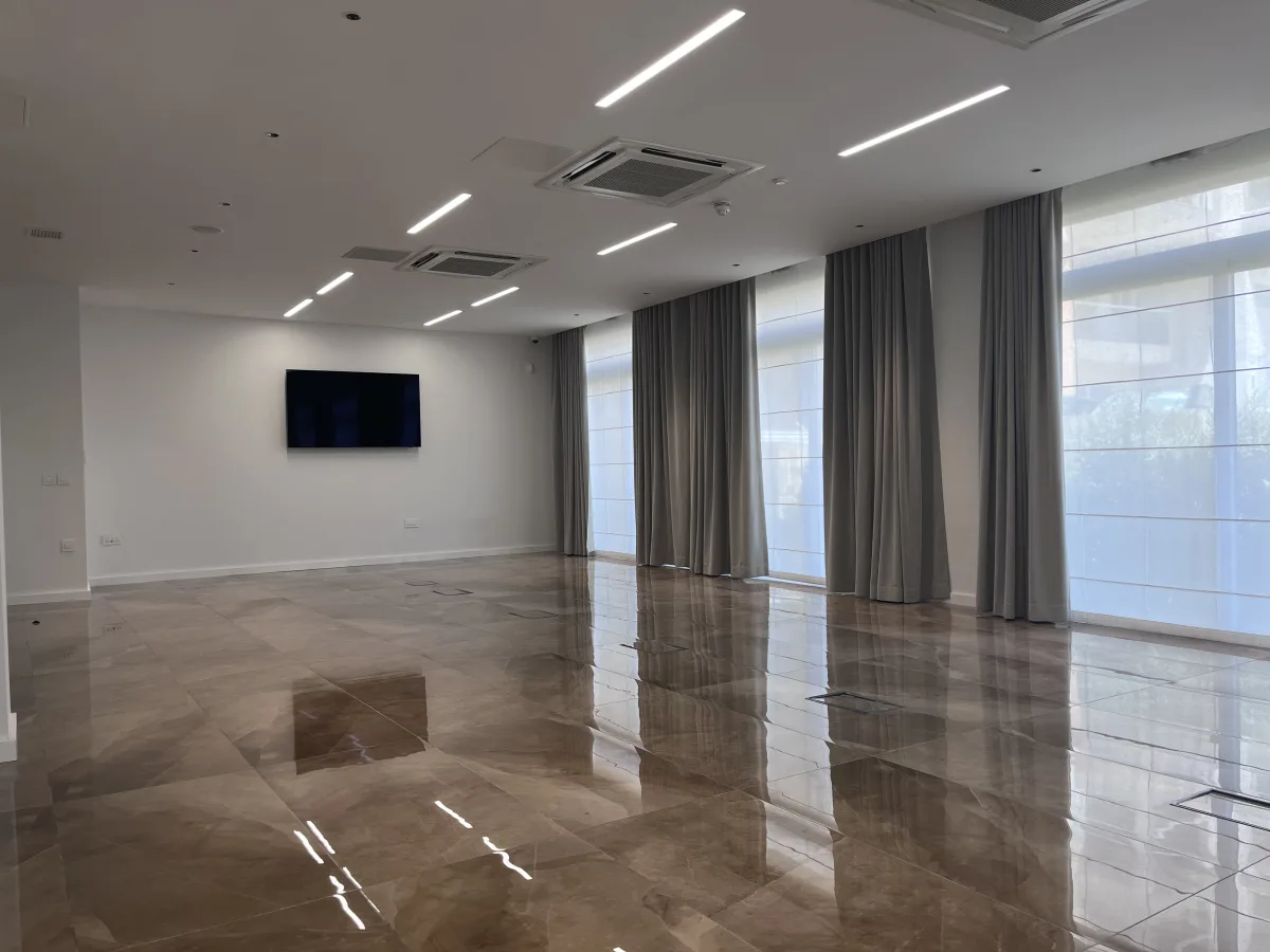 The office spans 370 square meters internally, plus an additional 10 square meters of balconies at both the front and back, exuding elegance and sophistication. The layout includes a welcoming reception area, a lounge featuring a large aquarium, a director's office with an adjacent personal assistant's space, a spacious boardroom equipped with a TV and large screen projector, variously sized offices, and separate male and female restrooms.